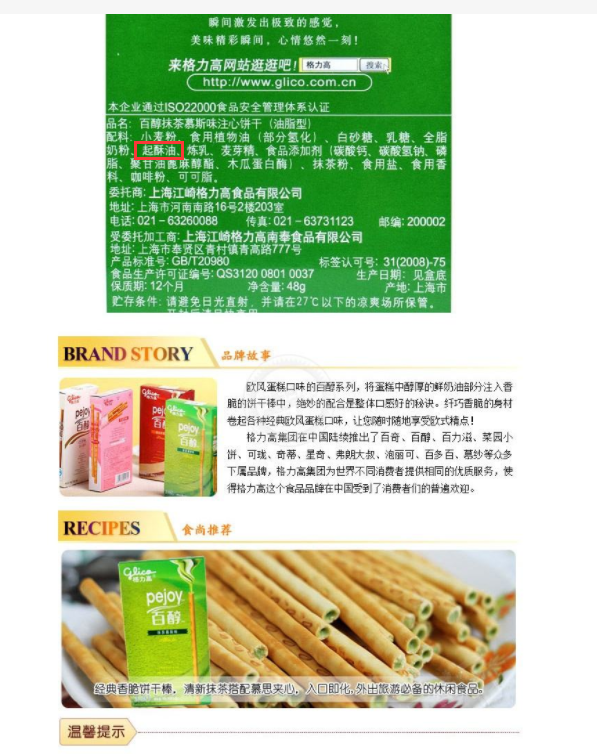 百醇配料表中含氫化油以及起酥油。起酥油是以低熔點的牛油混合其他動物油,或者混合植物油做成的高熔點油脂,專門用來制作起酥皮,兩者都含有反式脂肪酸。