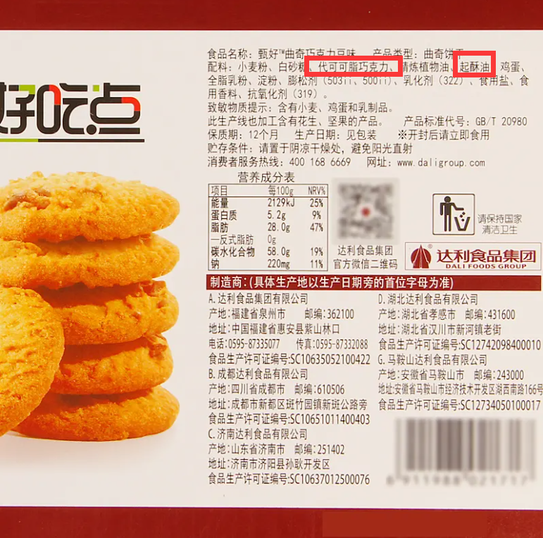 在好吃點的配料表中,除了有代可可脂巧克力以外,也有添加起酥油。起酥油含有大量的脂肪酸,它的熔點通常都在44度以上,是油脂類中熔點最高的一種食品配料,用它做出的點心口感會比較好。但是起酥油俗稱氫化油,屬于人造油脂氫化油,這種人造油脂氫化油就是我們說的對身體有害的油,長期食用會影響心血管的健康。
