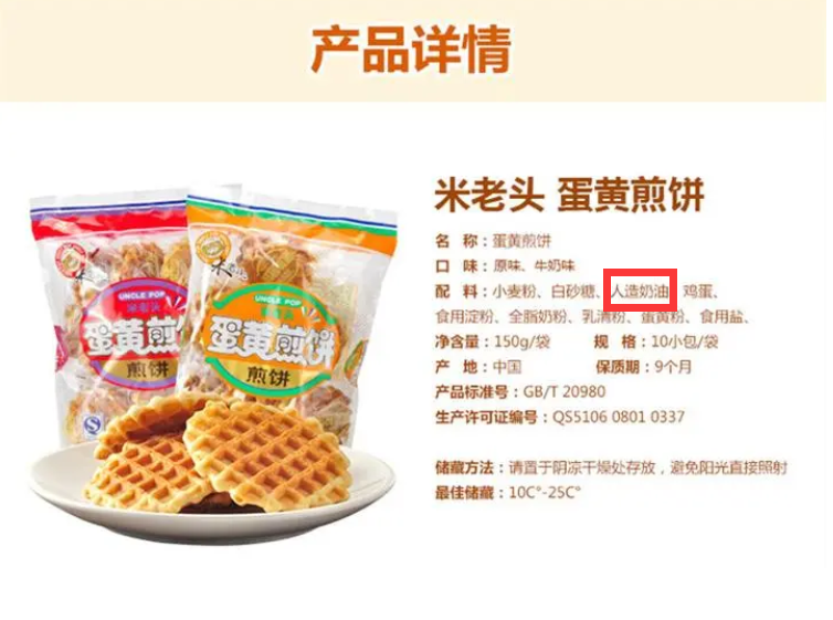 米老頭蛋黃煎餅配料表中含有人造奶油。人造奶油不像動物奶油那樣含有較高的膽固醇和熱量,但同樣含有大量的反式脂肪酸,食用后不能被消化,且增加大量的低密度脂類(也叫壞膽固醇)的含量,從而降低高密度脂類的密度,影響心血管健康和兒童生長發(fā)育。
