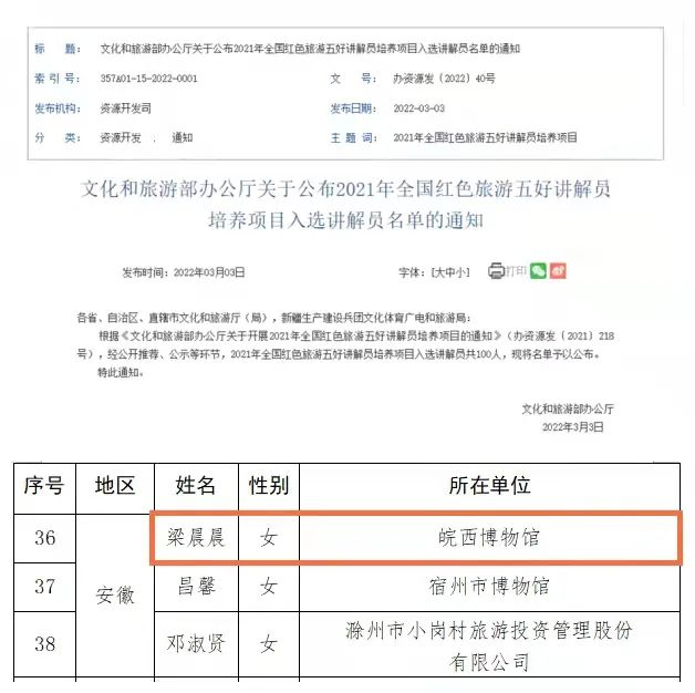 近日,文化和旅游部辦公廳公布了2021年全國紅色旅游五好講解員培養(yǎng)項目入選講解員名單,經(jīng)選拔,六安市文物保護中心(皖西博物館)講解員梁晨晨入選該名單。