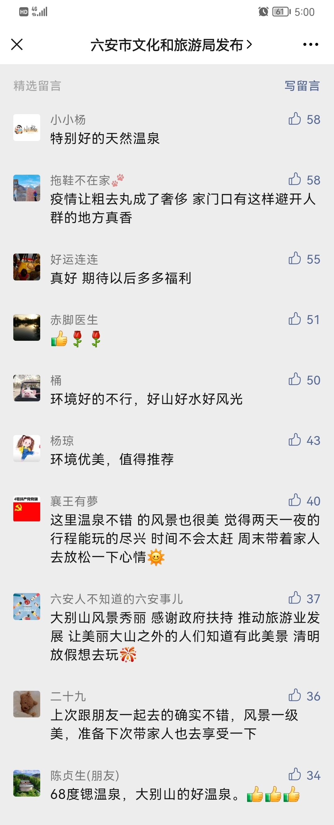 (責(zé)任編輯:君君)為回饋廣大網(wǎng)民朋友,六安市文旅局公眾號舉辦了“文末留言贈陡沙河溫泉門票”活動。