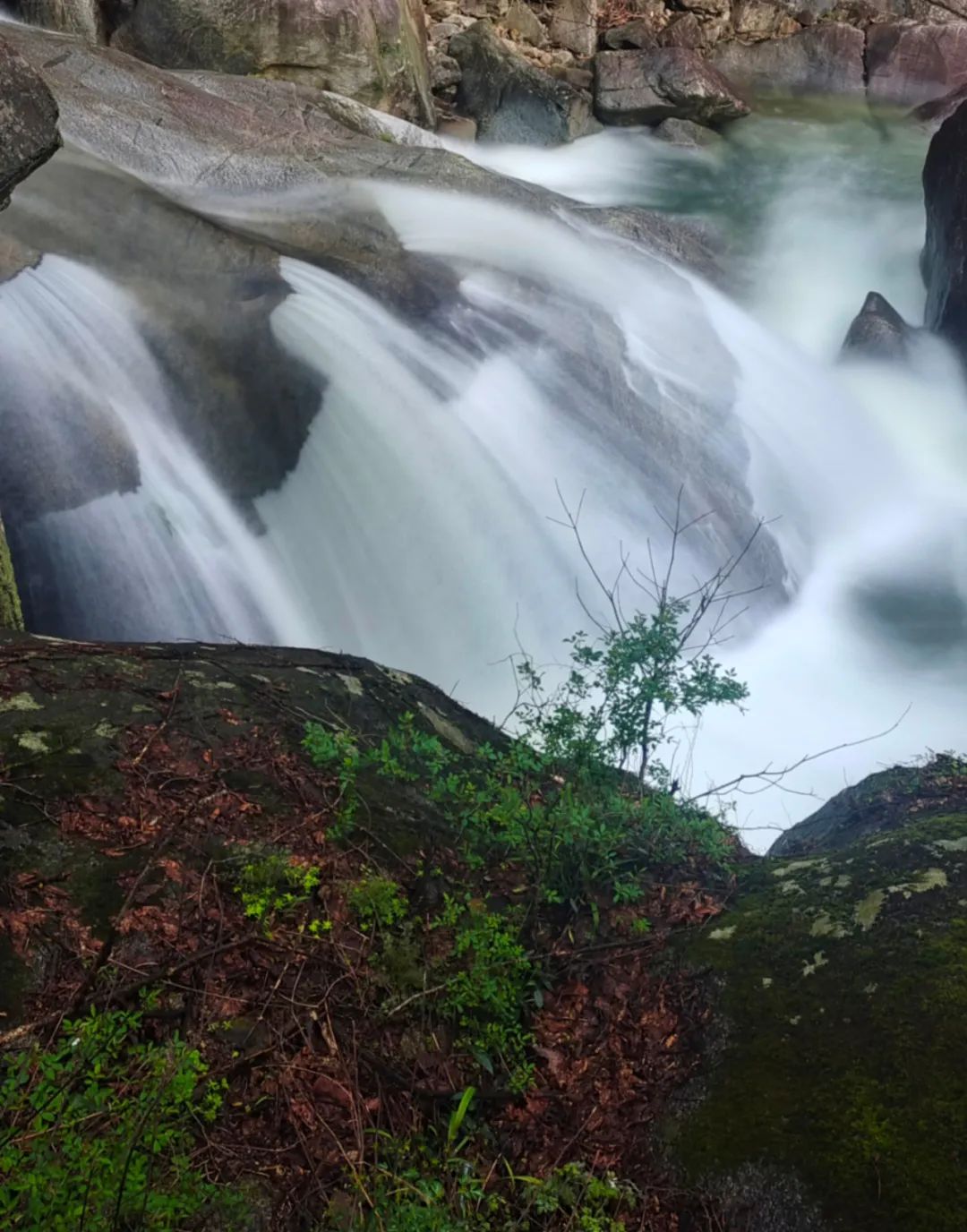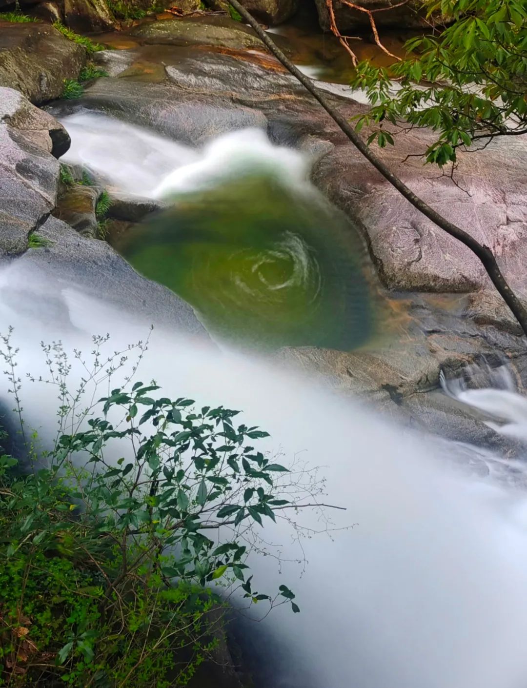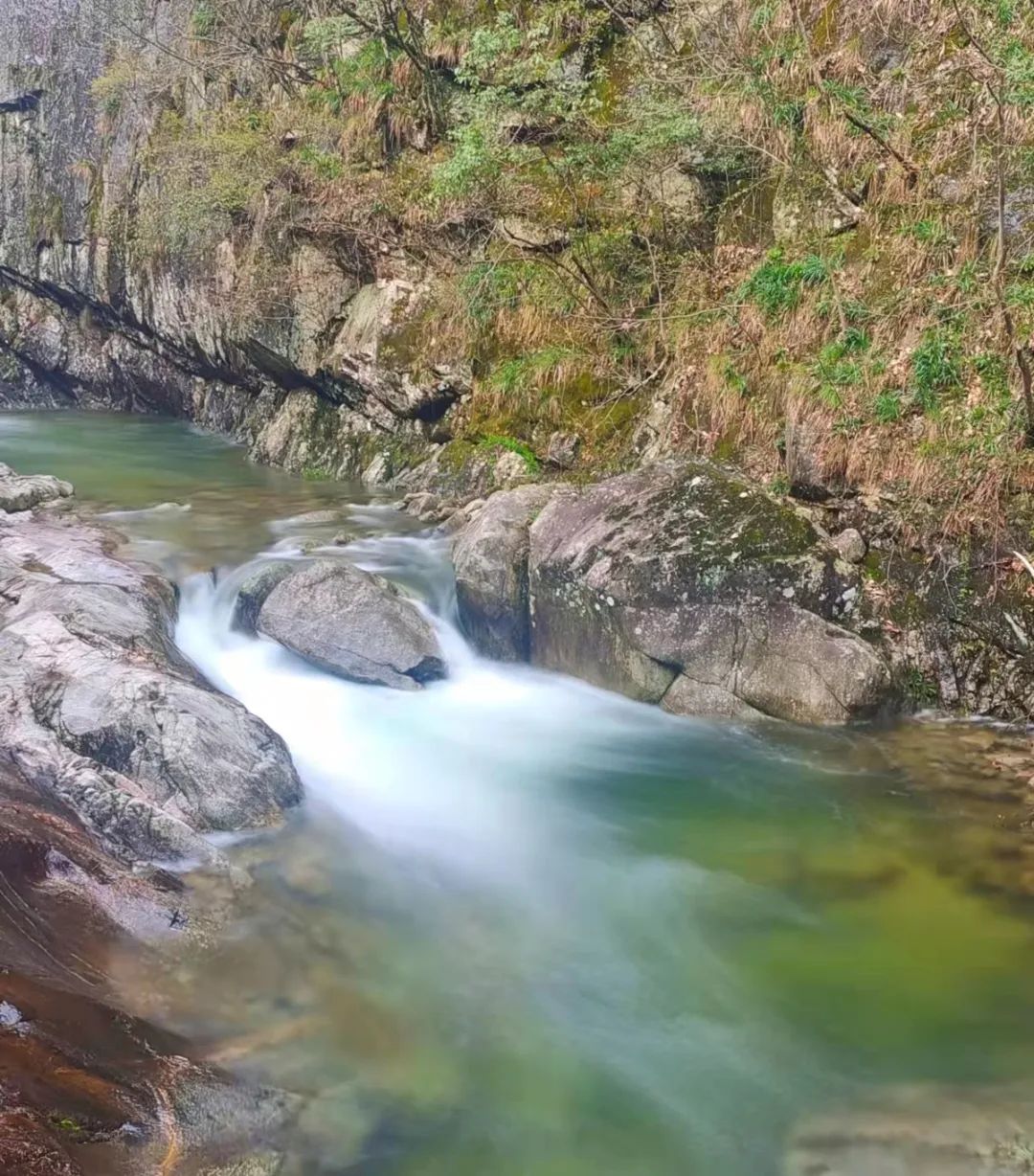 向?qū)嵝颜f(shuō),連續(xù)下雨,可能河道水量充沛,無(wú)法到達(dá)第二道瀑布,大家商量了一下,分成兩撥,我們幾個(gè)繼續(xù)前進(jìn),上行到第一道瀑布的上游后,抬眼望去,峰擠崖?lián)?,山石錯(cuò)落,這灣水卻依山繞石,不急不躁徑直向前。河床變得開(kāi)闊,水流鋪展開(kāi)身軀,宛如一匹平滑美麗的緞面;河床狹窄時(shí),水流收攏起手腳,依然是頑強(qiáng)地向前流,依然是千曲萬(wàn)折,卻還是那般的矜持和溫順,還是那樣的堅(jiān)韌和有序。