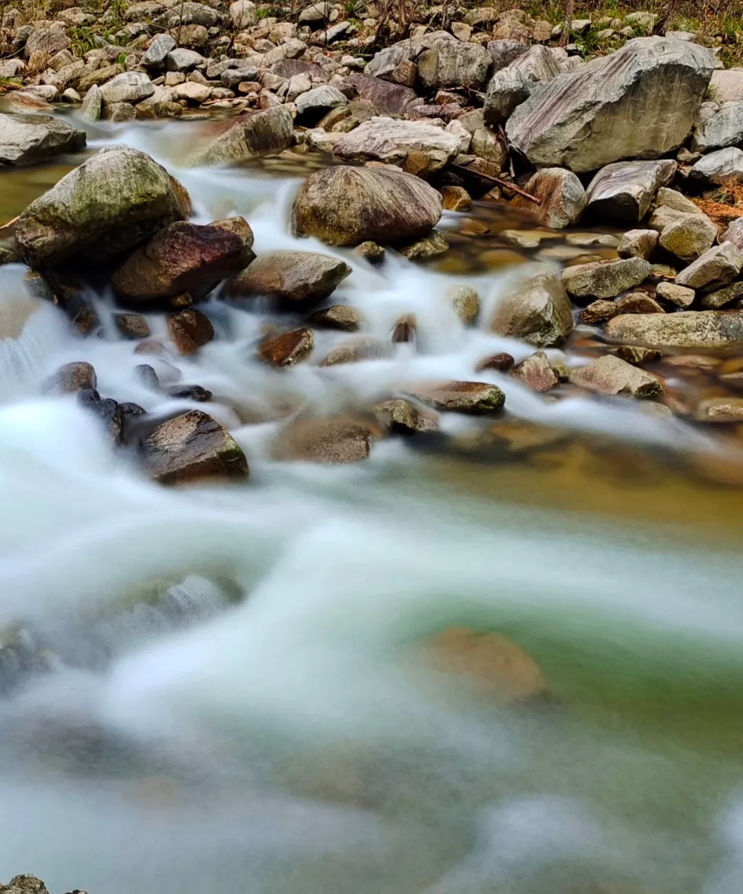 這一片靜謐的世界正在耳邊細(xì)語(yǔ),恍惚而縹緲,呼吸著山林散發(fā)的溫潤(rùn)氣息,一邊走,一邊聽(tīng)到水聲越來(lái)越近,溝澗出現(xiàn)在眼前,大約十米寬的河流,充盈著水汽,掩映之中,不時(shí)有奇石撞進(jìn)眼簾,山岳大都以石為骨,水之媚,有石焉,累累然而多。大,小,方,圓,袤尺不一,色澤蒼潤(rùn),有了石的滋養(yǎng),春的沉凝,這灣水也有了不一樣的清澄和寧?kù)o,水流不大也不急,行止健穩(wěn),既不嘩眾取寵,也不狂放囂張,那份嫻靜,那股柔婉,恰是我心目中絕佳的女性的秉質(zhì)。