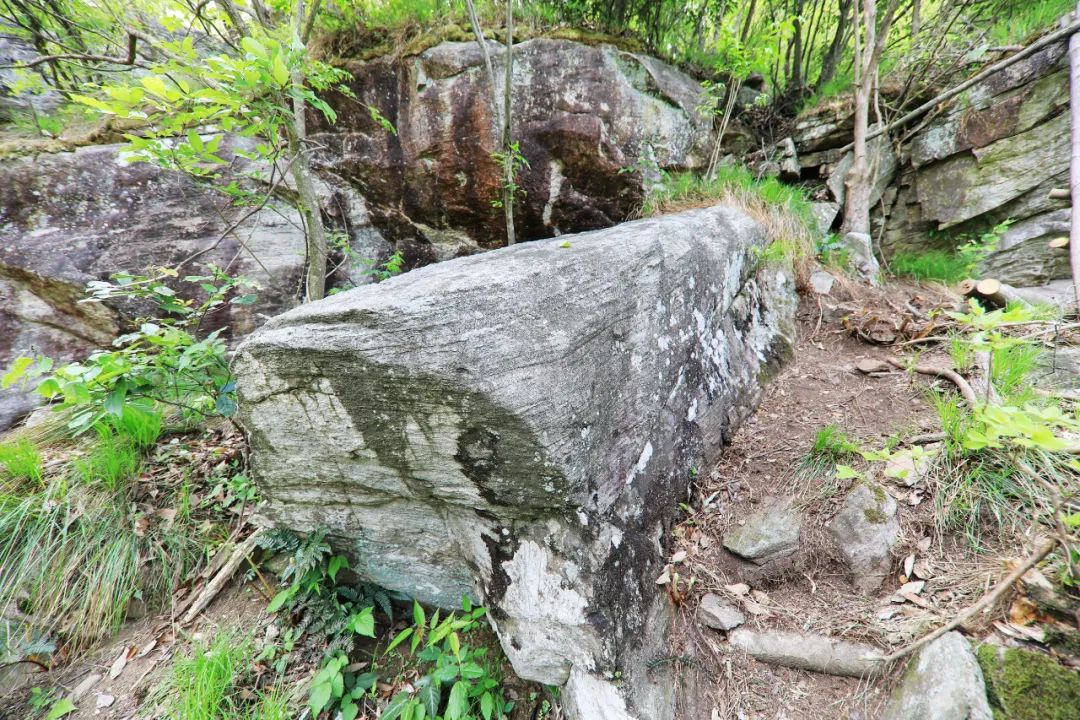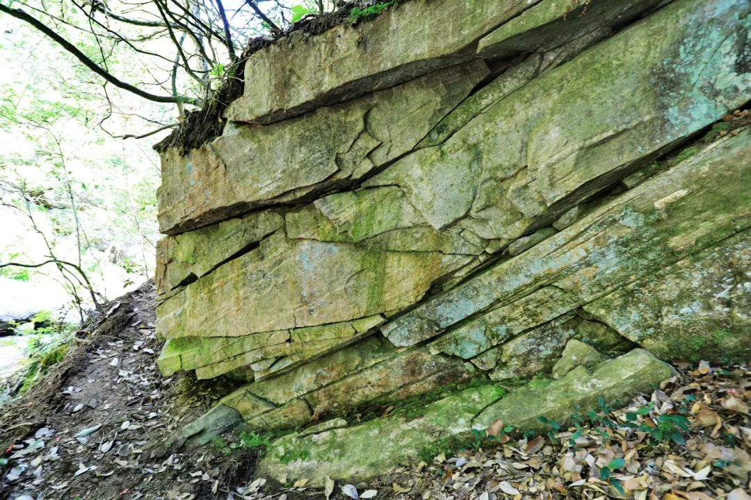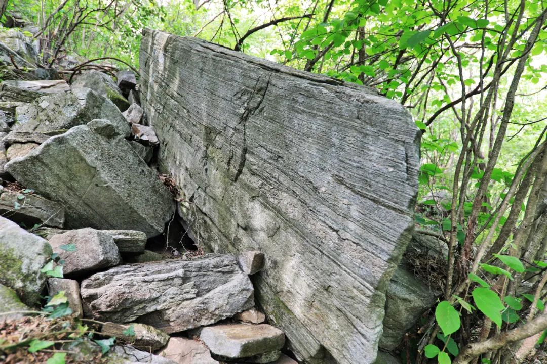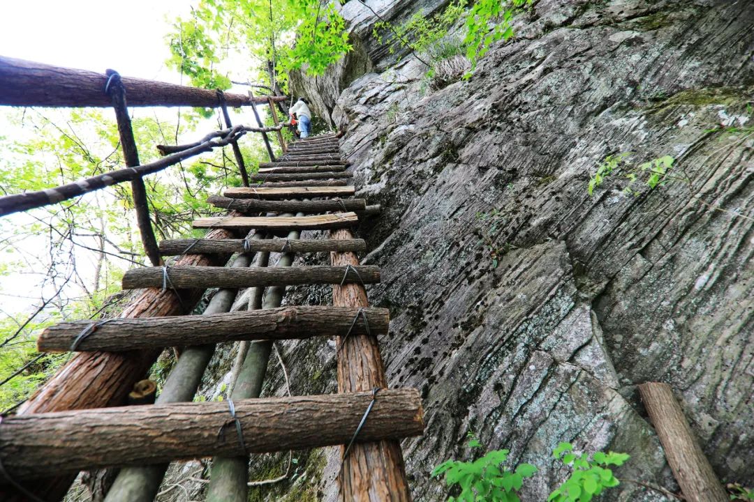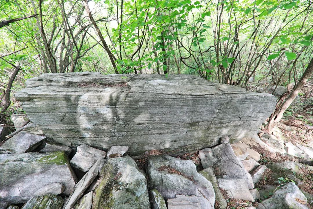 稍作歇息,繼續(xù)沿懸崖旁搭建的天梯攀爬至崖頂,呈現(xiàn)在眼前的則是另外一番天地,碩大的山體被懸崖占據(jù),一個長約60米,寬6米,高5米的懸空石洞鑲嵌在崖底,洞壁圓潤光滑,而洞底則是亂石林立,疑是修煉斗法的仙家禁地,不禁讓人心生敬畏。面對復雜多變的地勢,徒手攀爬很是困難,好在村民在修筑便道時搭建了2號天梯,扶梯而上,心中一驚,為何會有一副棺材放在旁邊。定睛一看,原來是石棺,形象至極,據(jù)說,遇到石棺之人財運亨通。石棺不遠處,一個石棺蓋讓我思緒萬千,或許這是在提醒世人,人生是一場旅行,別過分關注遠方目的地,品味沿途的風景才更加重要。數(shù)十載的功祿名利,待到蓋棺之時,一切皆為云煙。