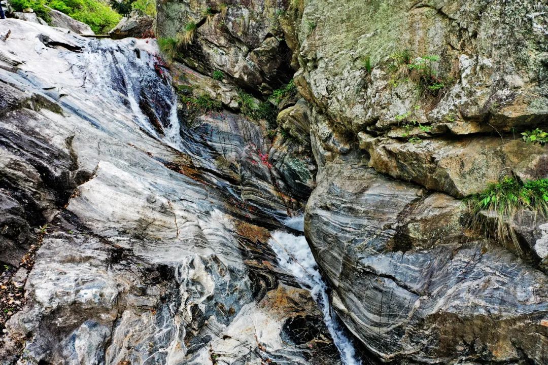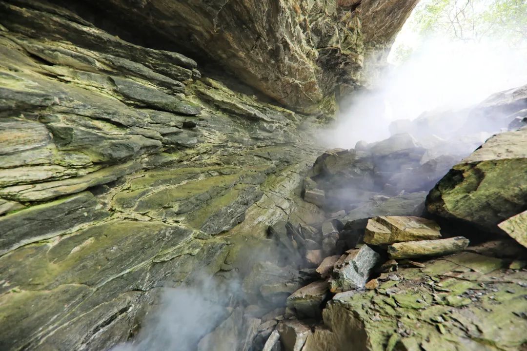 越往景區(qū)深處走,道路越陡,峽谷落差越大,奇形怪狀的山石淡定徜徉于谷底,任由溪水撩撥自己也不為所動,水流穿行其間,遇到低洼之處,化作深潭,落差之處并為瀑布,駐足遠望,潭潭相連、瀑瀑相接、高山流水,錯落有致。繞過一塊巨石,又一道瀑布出現(xiàn)在眼前。瀑布兩旁,崖體濕滑,很難走近,細細觀望,在瀑布底部石壁上,兩個圓形的水坑像極了動物的眼睛,據(jù)說,這就是麒麟的雙目。