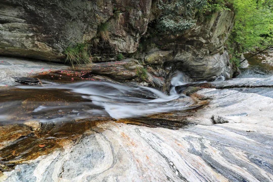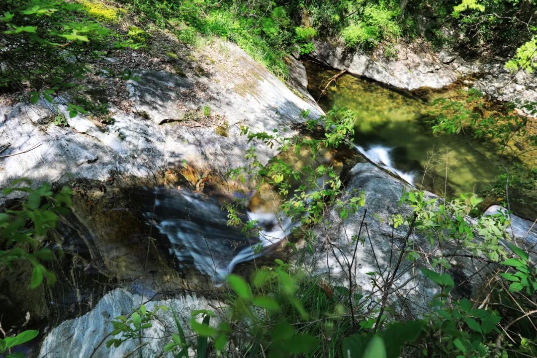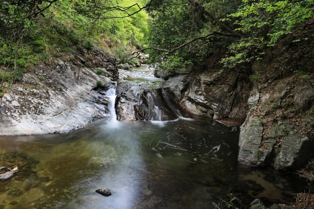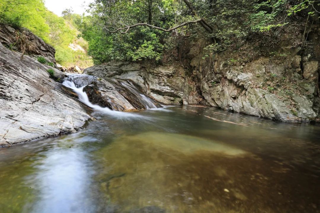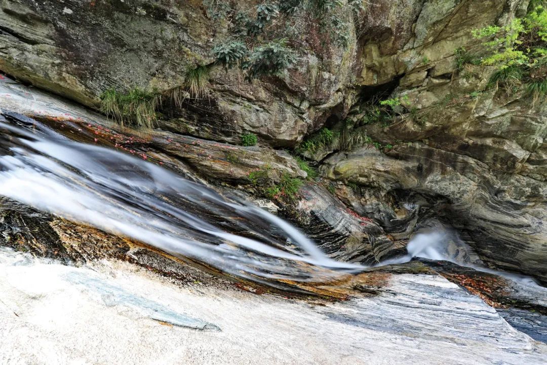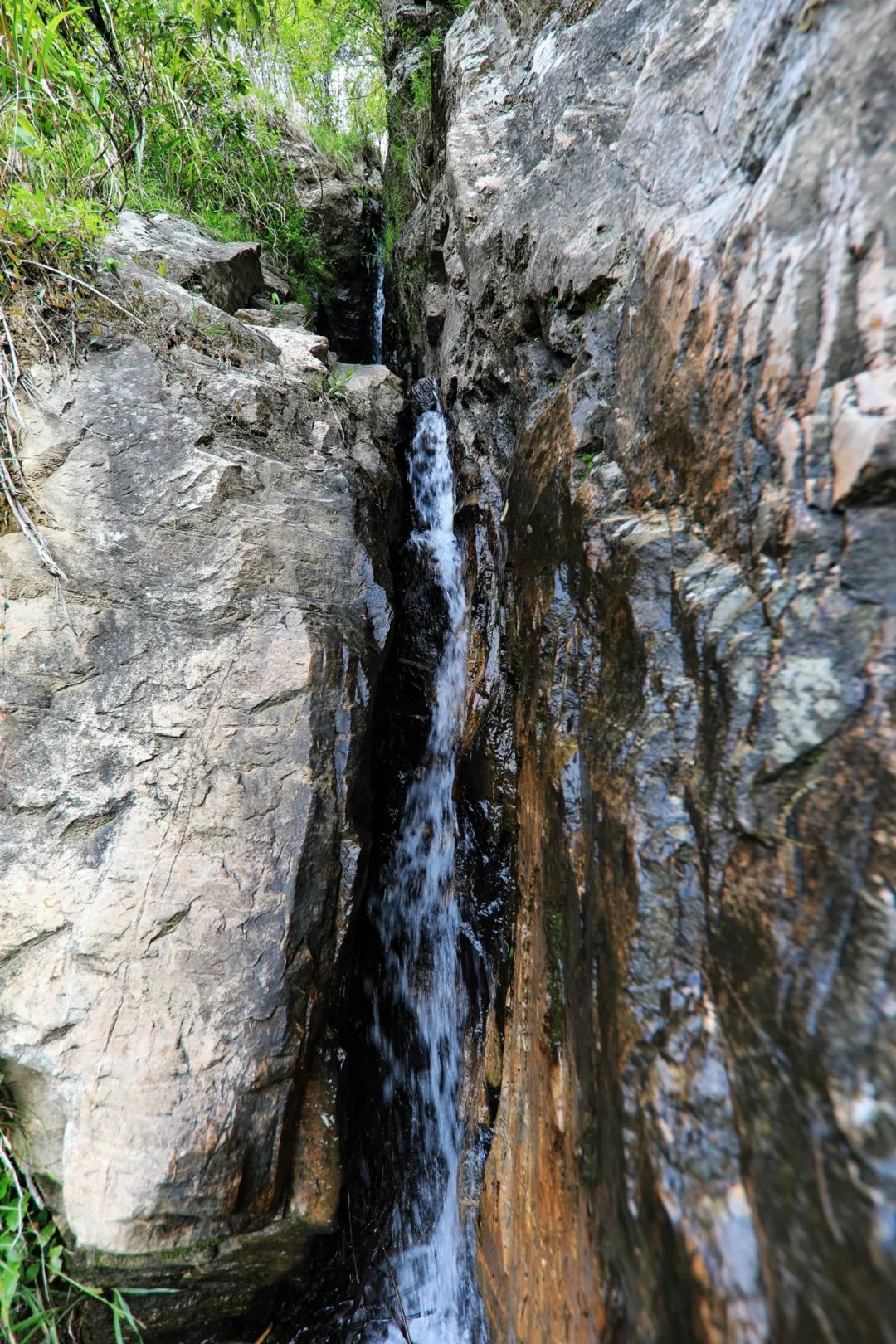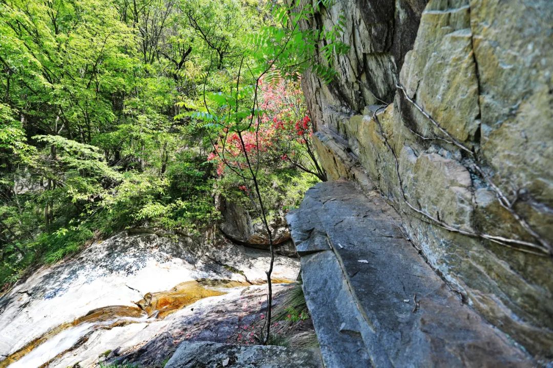沿山道前行,身旁流淌著潺潺溪水,一個個水潭碧綠見底,時不時有魚兒游動的身影;山道兩旁,映山紅含露綻放,羞羞答答地向人示好;活潑的鳥兒,躲進山崖的花叢,小心翼翼地向我們張望;有了花兒綻放、溪水為伴、鳥兒鳴唱,靜怡、單調、刺激的谷道漫步注入勃勃生機、探秘的欲望被瞬間激發(fā)。