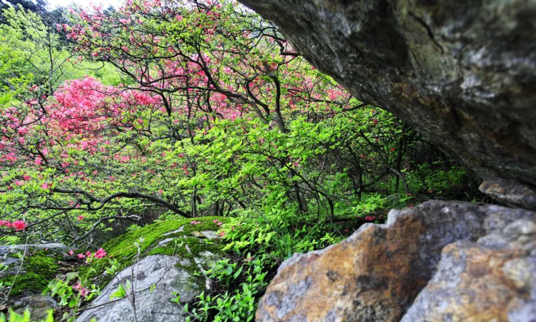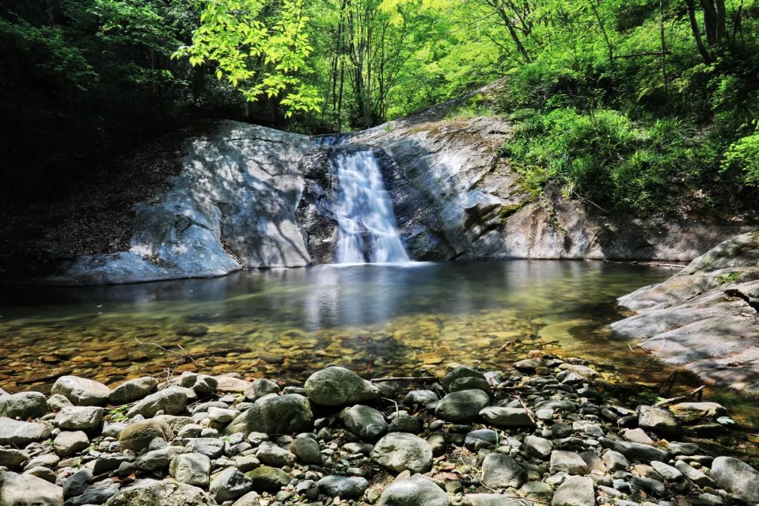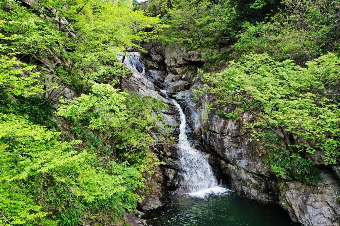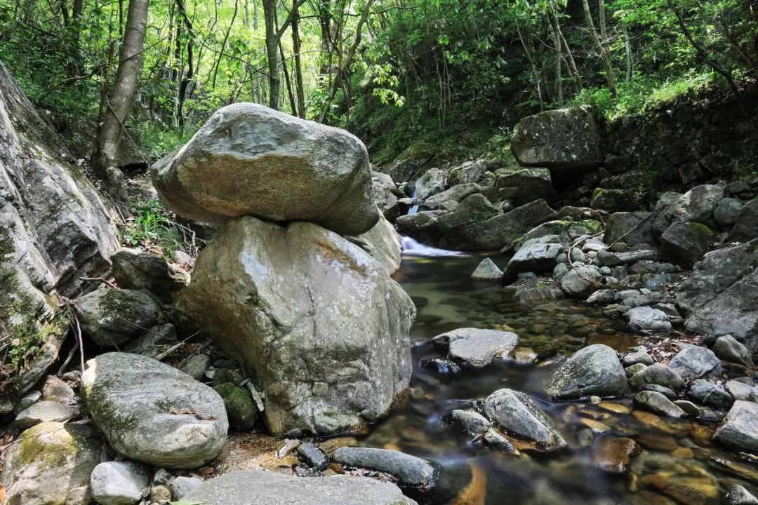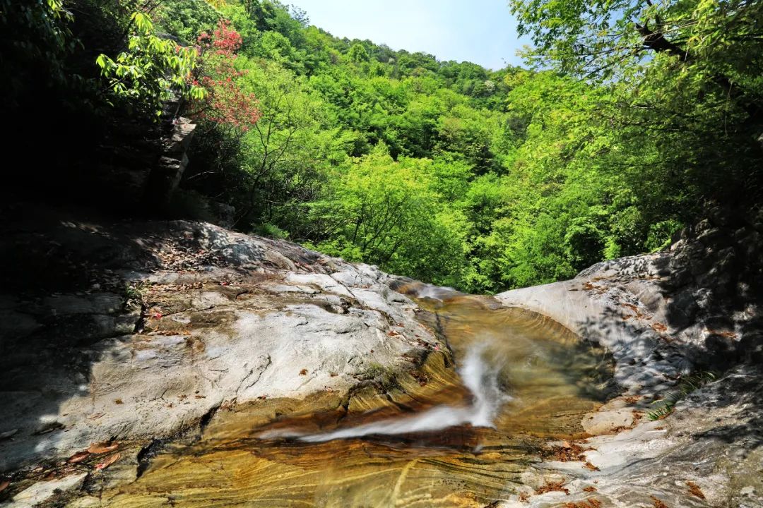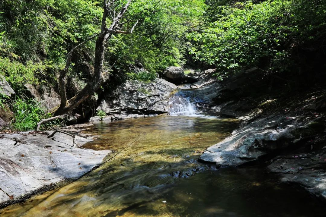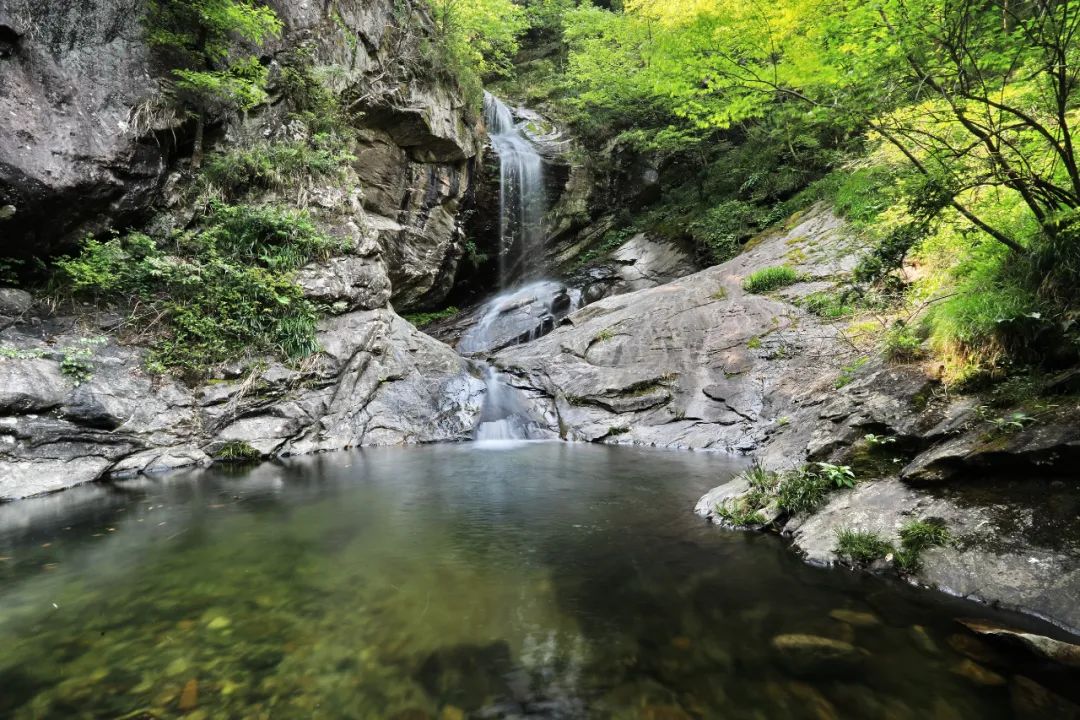 沿山道前行,身旁流淌著潺潺溪水,一個個水潭碧綠見底,時不時有魚兒游動的身影;山道兩旁,映山紅含露綻放,羞羞答答地向人示好;活潑的鳥兒,躲進山崖的花叢,小心翼翼地向我們張望;有了花兒綻放、溪水為伴、鳥兒鳴唱,靜怡、單調、刺激的谷道漫步注入勃勃生機、探秘的欲望被瞬間激發(fā)。