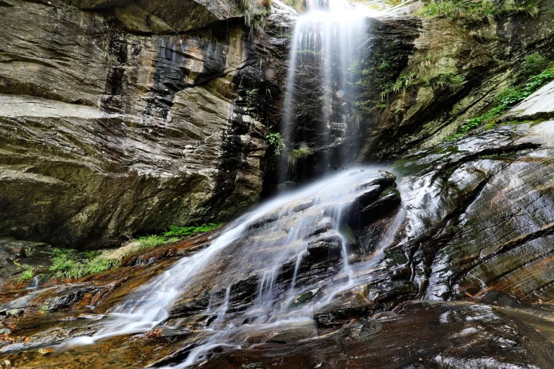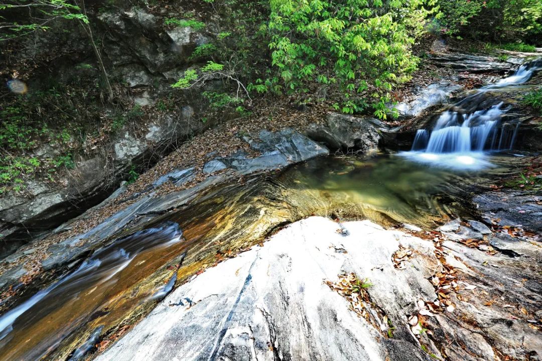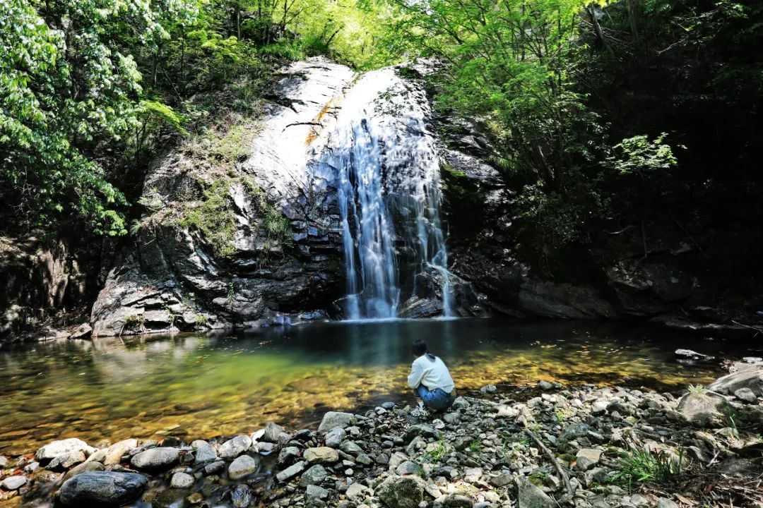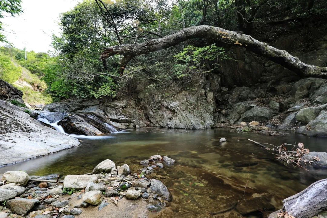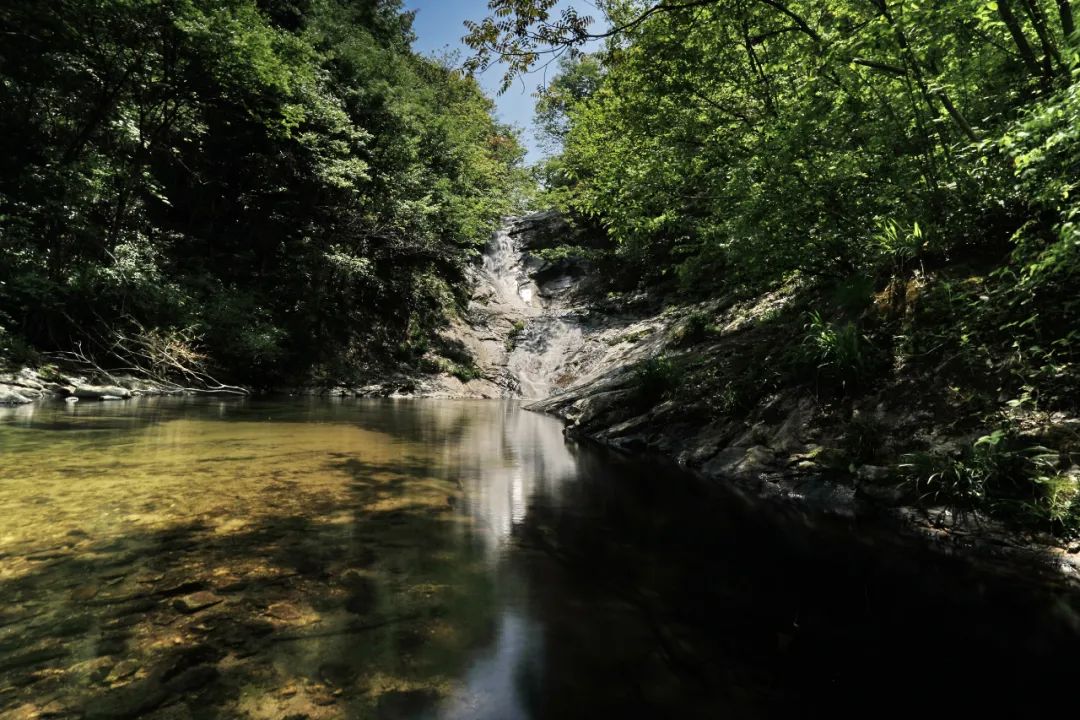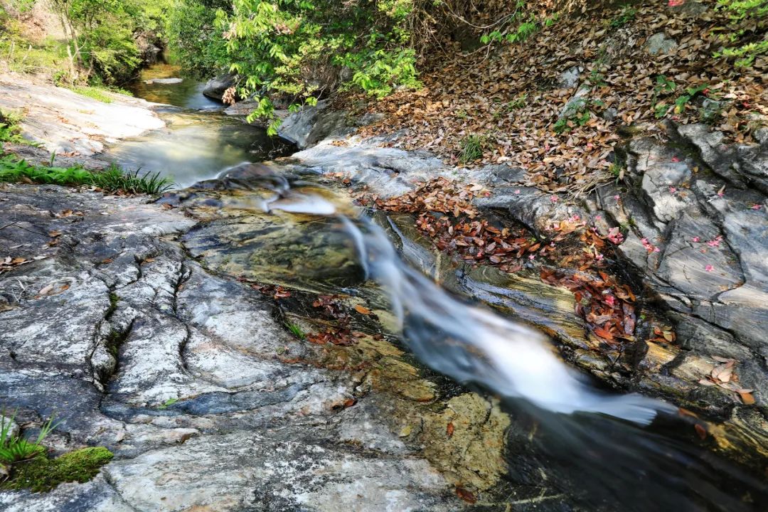 初入峽谷,開闊的水潭像屏風一樣出現(xiàn)在面前,一道水簾順著巖石上緩緩滑入潭中,隨暗流起舞的漩渦在水面游弋,泛起無數(shù)個大大小小的漣漪。不遠處,水流撞擊巖石的聲音不絕于耳,循聲走近,陡峭的懸崖將河谷截斷,形成數(shù)十米的落差,水流從崖頂?shù)乃吨屑彼傩瓜?,沿石壁跌跌撞撞地砸向崖底,發(fā)出悅耳聲響。因未到豐水期,雖沒有萬馬奔騰的恢弘氣勢,但眼前飛流直下的壯觀足以讓人心生澎湃。