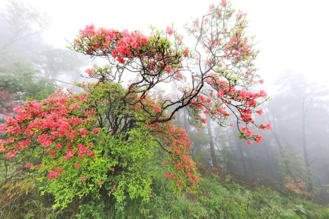 三嶺盛裝映山紅,四瀑流川天掛簾。