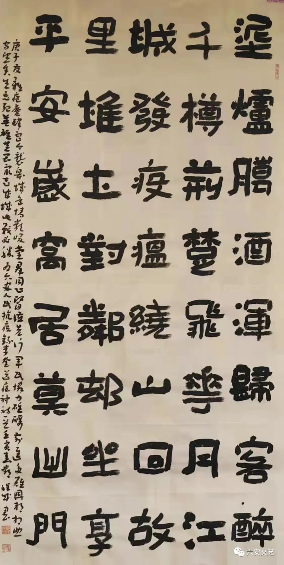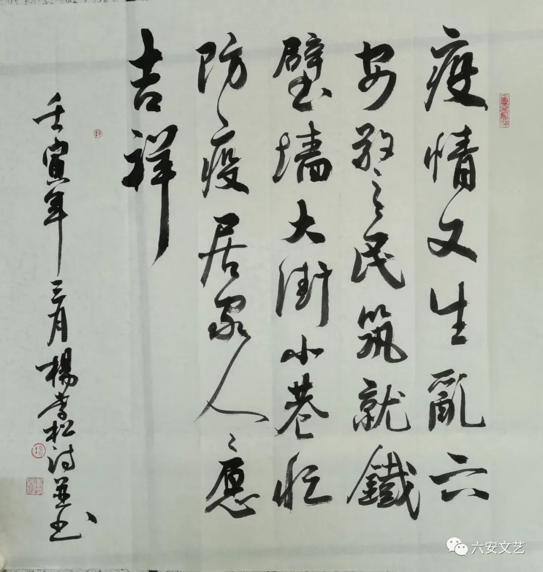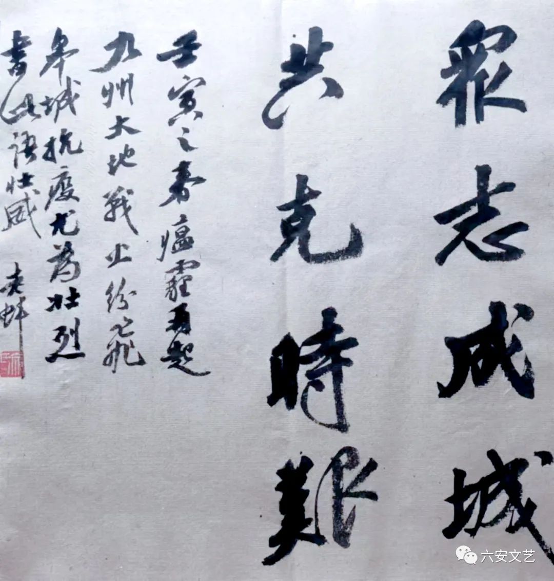 4月4日,六安市發(fā)生了一起本土奧密克戎病毒新冠疫情,形勢嚴峻復雜。市委、市政府決定在城區(qū)開啟靜態(tài)管控,開展全員核酸檢測,各項疫情防控工作正嚴密有序開展。自疫情防控工作開展以來,六安市文聯迅速行動,向所屬的文藝家協會發(fā)出倡議,號召全市文藝界全力支持配合疫情防控工作,用文藝作品記錄、歌頌全市上下抗擊疫情的感人事跡和動人瞬間,得到了全市廣大文藝工作者及文藝愛好者的大力支持。現推出“文藝助力‘藝’起行動”系列公眾號文章,今天推出《六安市文藝界抗擊疫情主題文藝作品集(書法篇)》,分上下兩篇推出,今天推出上篇,共推出30幅書法作品。
