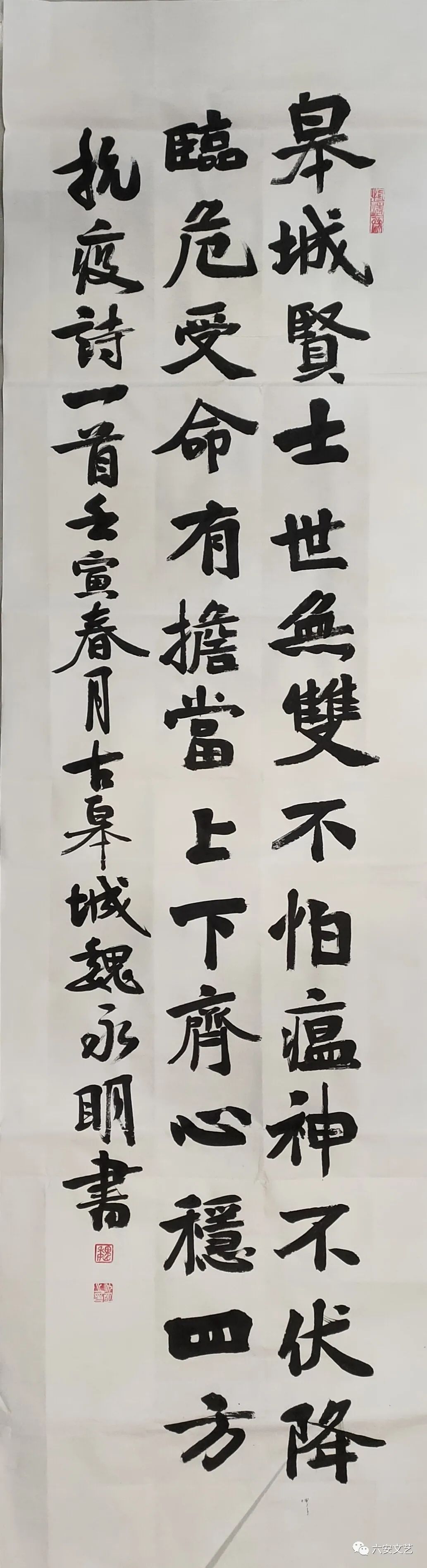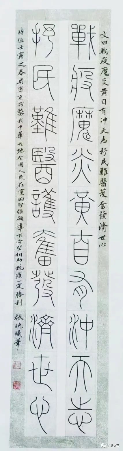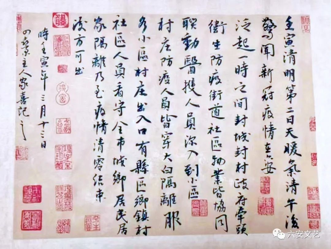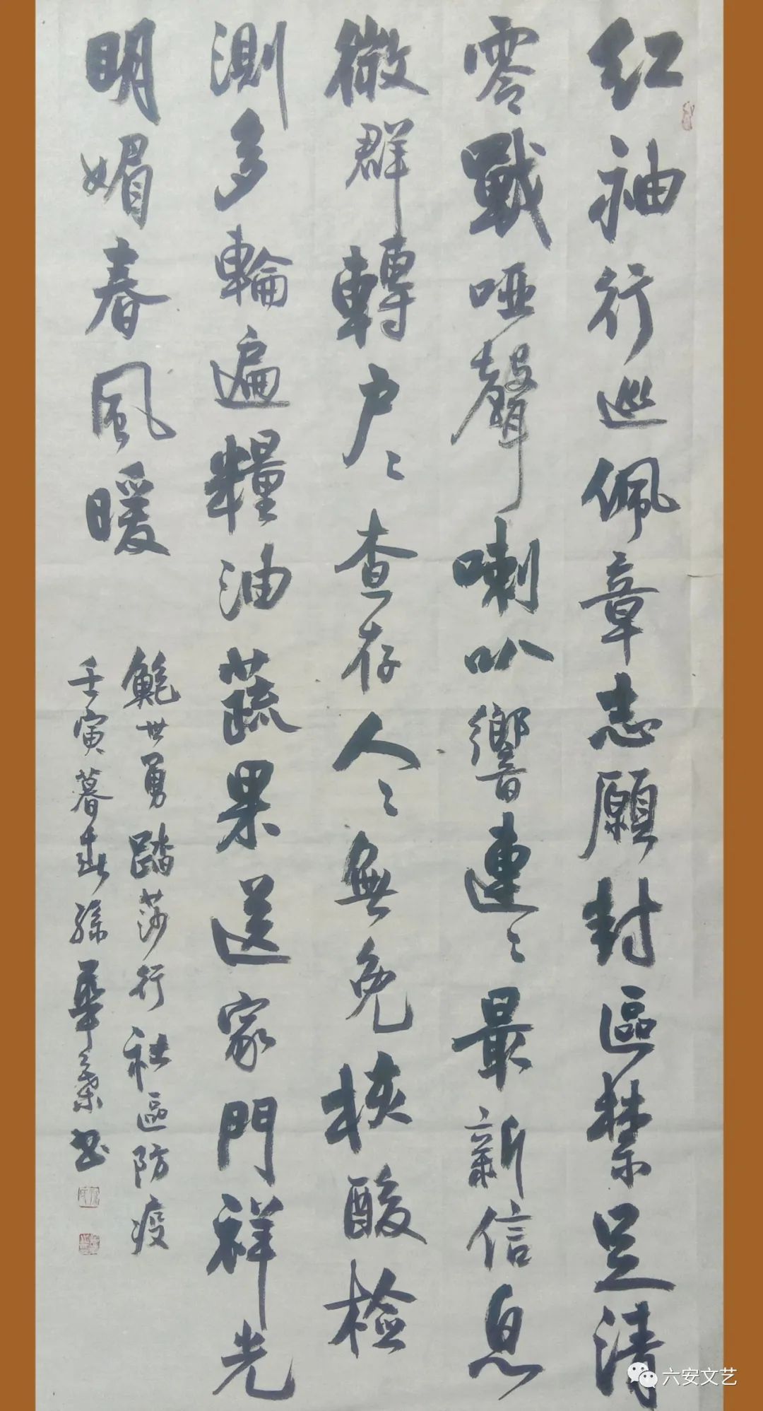 4月4日,六安市發(fā)生了一起本土奧密克戎病毒新冠疫情,形勢嚴峻復雜。市委、市政府決定在城區(qū)開啟靜態(tài)管控,開展全員核酸檢測,各項疫情防控工作正嚴密有序開展。自疫情防控工作開展以來,六安市文聯迅速行動,向所屬的文藝家協會發(fā)出倡議,號召全市文藝界全力支持配合疫情防控工作,用文藝作品記錄、歌頌全市上下抗擊疫情的感人事跡和動人瞬間,得到了全市廣大文藝工作者及文藝愛好者的大力支持。現推出“文藝助力‘藝’起行動”系列公眾號文章,今天推出《六安市文藝界抗擊疫情主題文藝作品集(書法篇)》,分上下兩篇推出,今天推出上篇,共推出30幅書法作品。