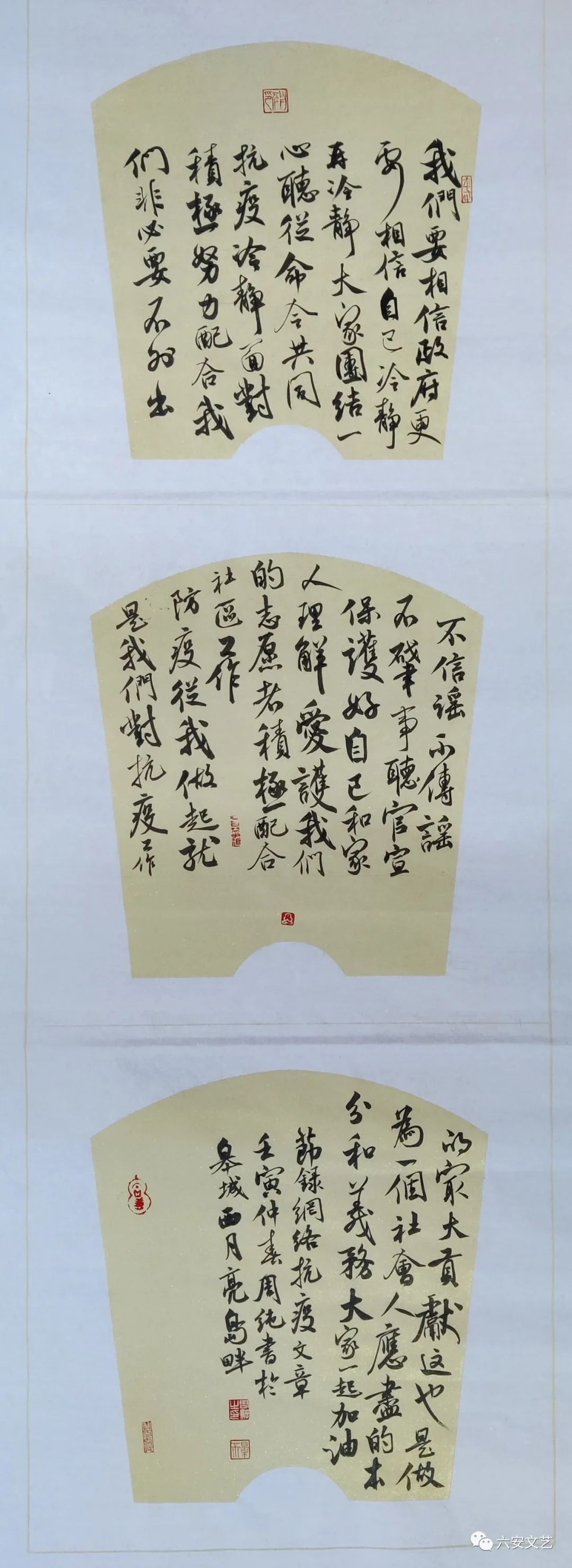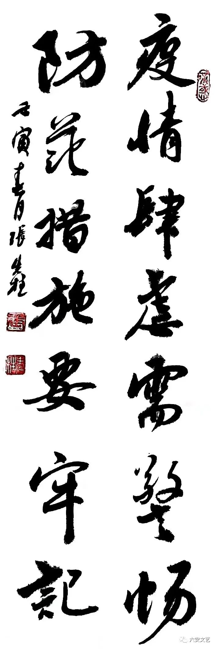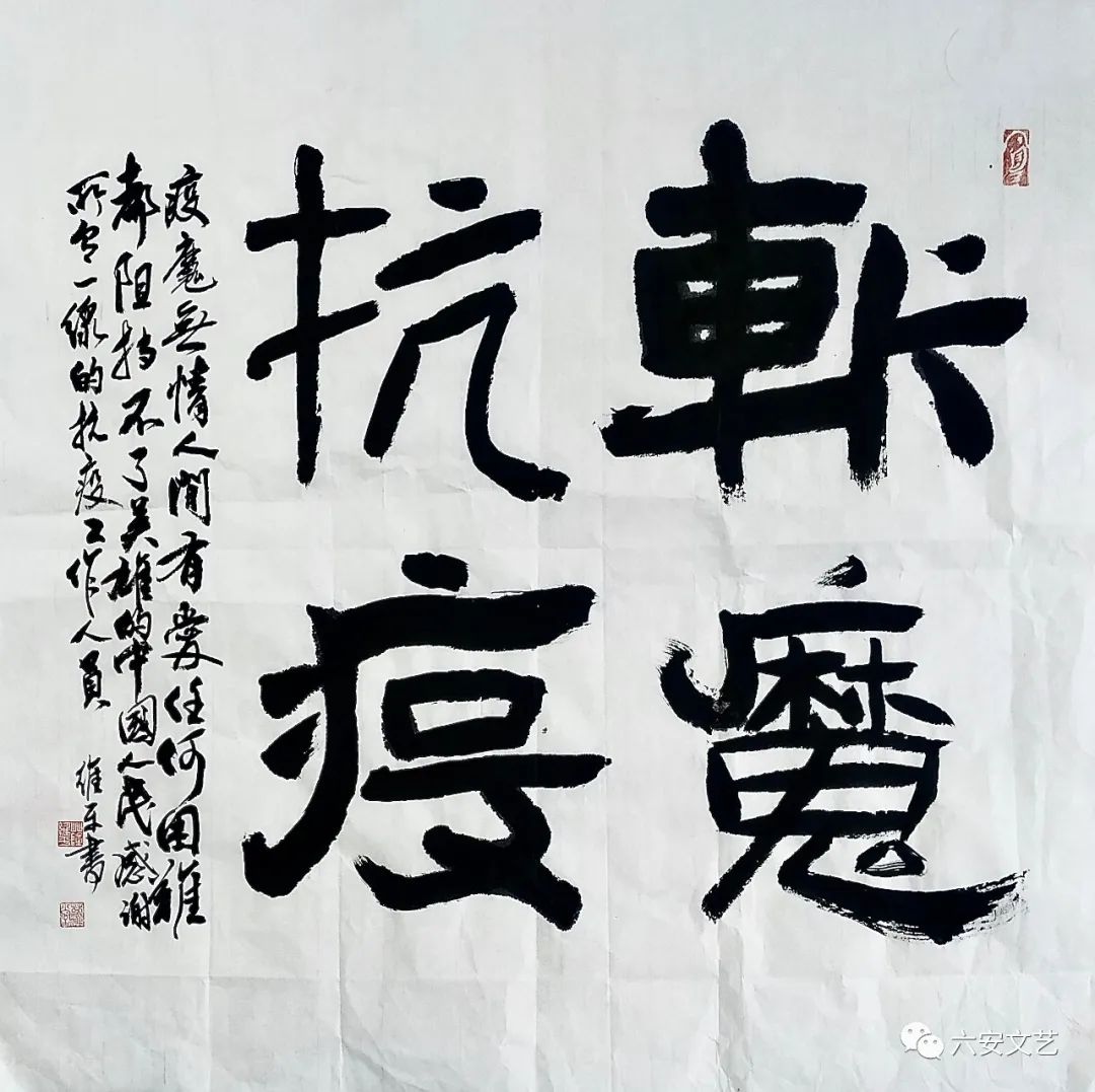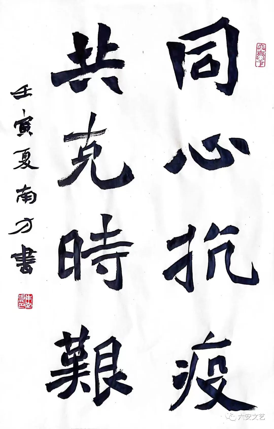 4月4日,六安市發(fā)生了一起本土奧密克戎病毒新冠疫情,形勢嚴(yán)峻復(fù)雜。市委、市政府決定在城區(qū)開啟靜態(tài)管控,開展全員核酸檢測,各項(xiàng)疫情防控工作正嚴(yán)密有序開展。自疫情防控工作開展以來,六安市文聯(lián)迅速行動,向所屬的文藝家協(xié)會發(fā)出倡議,號召全市文藝界全力支持配合疫情防控工作,用文藝作品記錄、歌頌全市上下抗擊疫情的感人事跡和動人瞬間,得到了全市廣大文藝工作者及文藝愛好者的大力支持?,F(xiàn)推出“文藝助力‘藝’起行動”系列公眾號文章,今天推出《六安市文藝界抗擊疫情主題文藝作品集(書法篇)》,分上下兩篇推出,今天推出下篇,共推出27幅書法作品。