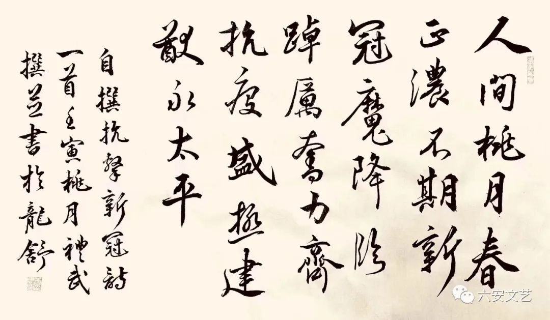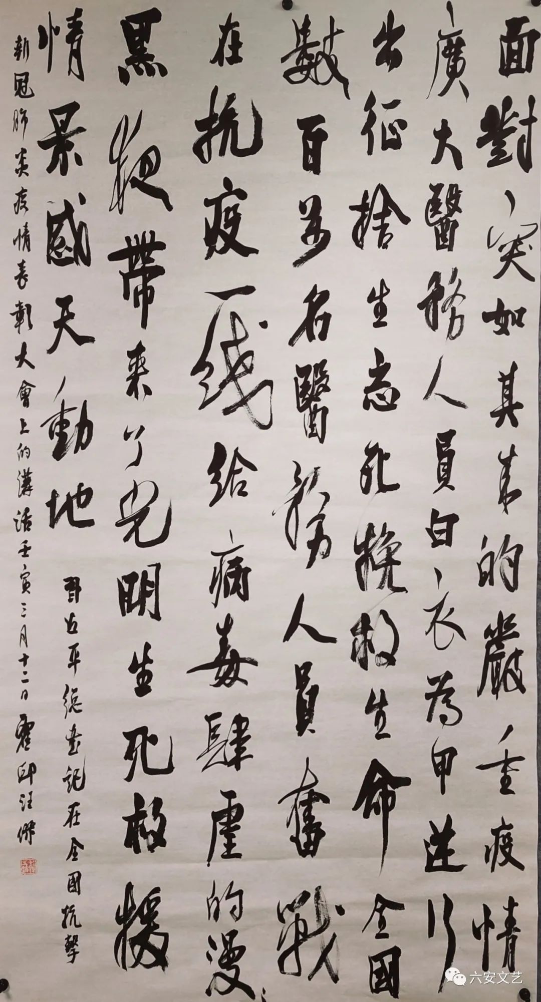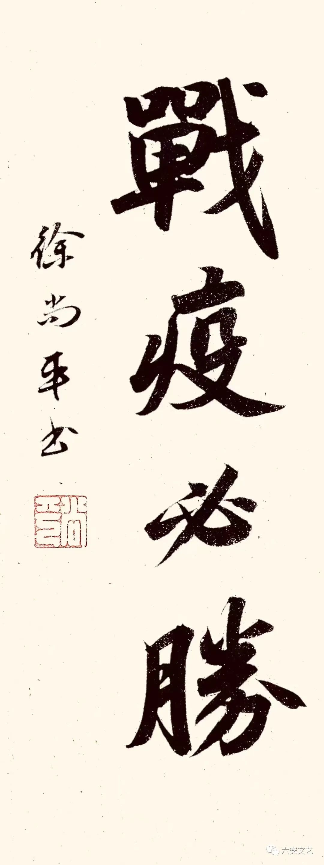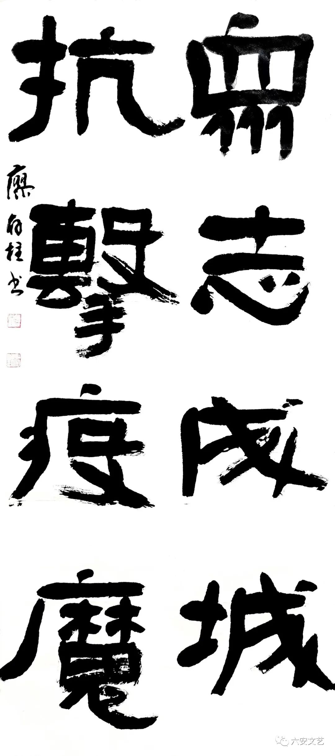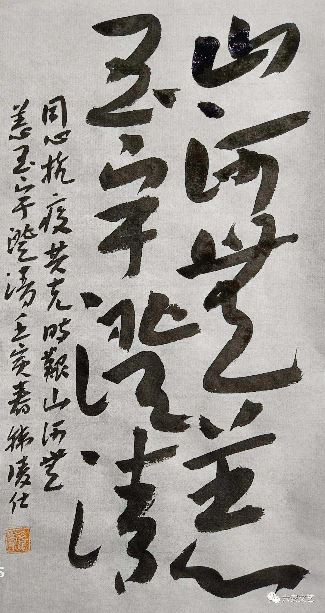 4月4日,六安市發(fā)生了一起本土奧密克戎病毒新冠疫情,形勢嚴(yán)峻復(fù)雜。市委、市政府決定在城區(qū)開啟靜態(tài)管控,開展全員核酸檢測,各項(xiàng)疫情防控工作正嚴(yán)密有序開展。自疫情防控工作開展以來,六安市文聯(lián)迅速行動,向所屬的文藝家協(xié)會發(fā)出倡議,號召全市文藝界全力支持配合疫情防控工作,用文藝作品記錄、歌頌全市上下抗擊疫情的感人事跡和動人瞬間,得到了全市廣大文藝工作者及文藝愛好者的大力支持?,F(xiàn)推出“文藝助力‘藝’起行動”系列公眾號文章,今天推出《六安市文藝界抗擊疫情主題文藝作品集(書法篇)》,分上下兩篇推出,今天推出下篇,共推出27幅書法作品。