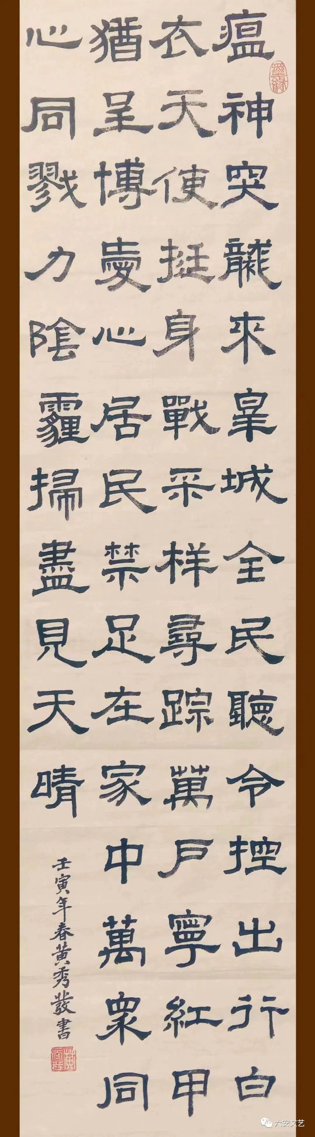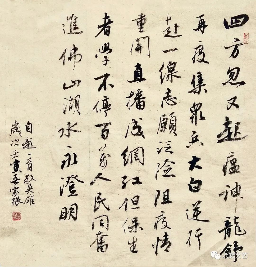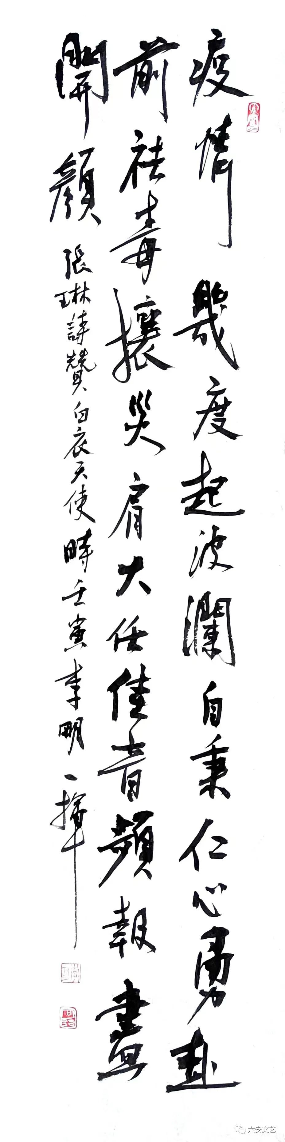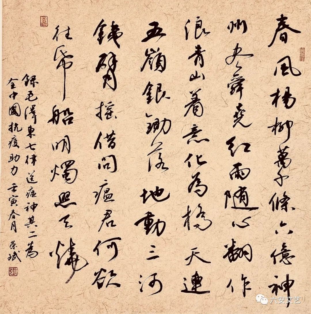 4月4日,六安市發(fā)生了一起本土奧密克戎病毒新冠疫情,形勢嚴(yán)峻復(fù)雜。市委、市政府決定在城區(qū)開啟靜態(tài)管控,開展全員核酸檢測,各項(xiàng)疫情防控工作正嚴(yán)密有序開展。自疫情防控工作開展以來,六安市文聯(lián)迅速行動,向所屬的文藝家協(xié)會發(fā)出倡議,號召全市文藝界全力支持配合疫情防控工作,用文藝作品記錄、歌頌全市上下抗擊疫情的感人事跡和動人瞬間,得到了全市廣大文藝工作者及文藝愛好者的大力支持?,F(xiàn)推出“文藝助力‘藝’起行動”系列公眾號文章,今天推出《六安市文藝界抗擊疫情主題文藝作品集(書法篇)》,分上下兩篇推出,今天推出下篇,共推出27幅書法作品。