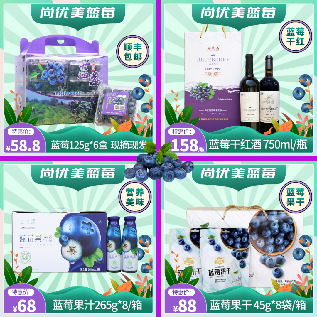 采摘券、藍(lán)莓汁、冰酒、藍(lán)莓干紅、藍(lán)莓果干