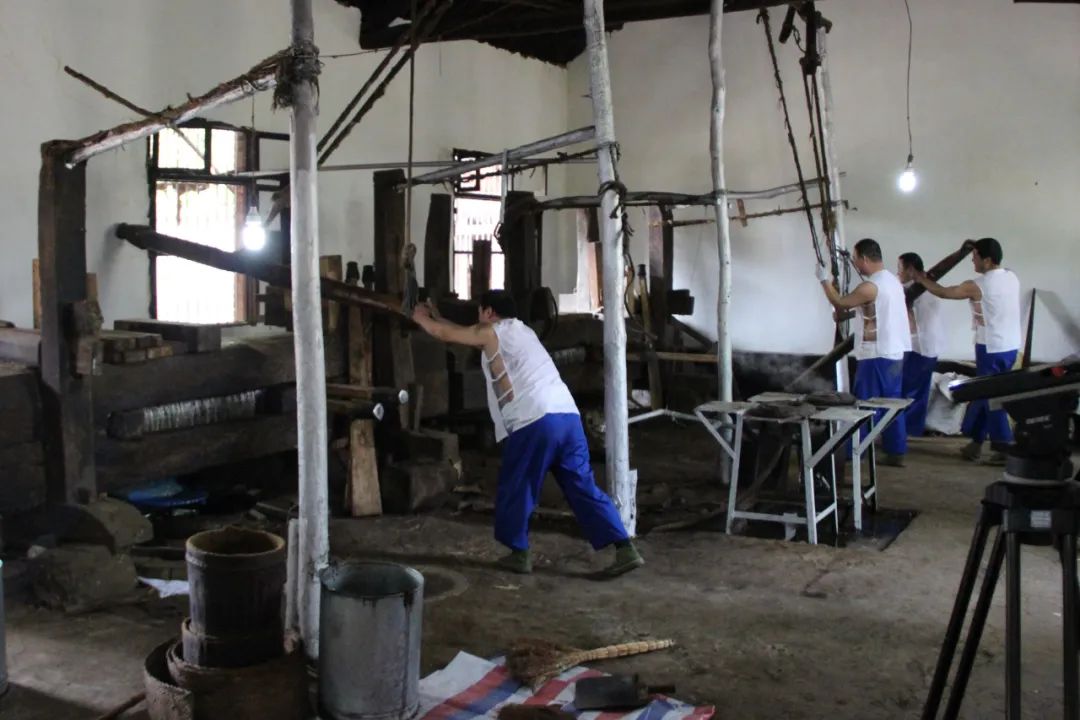 師傅們在練習(xí)木榨油技藝過程中一次次地嘗試,自創(chuàng)了一套省力的絕活,俗稱“猴子翻山”。古老的一根撞木,嫻熟的一雙巧手,得心應(yīng)手的翻轉(zhuǎn)之間,往往需要數(shù)千個日夜心手合一的磨合。