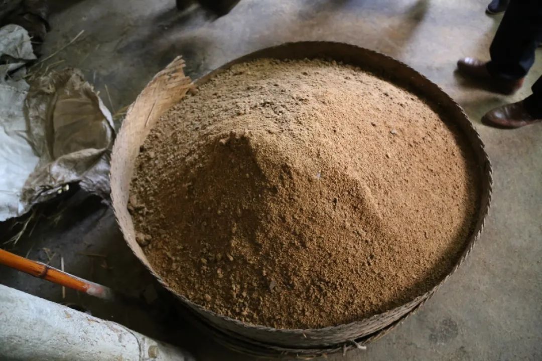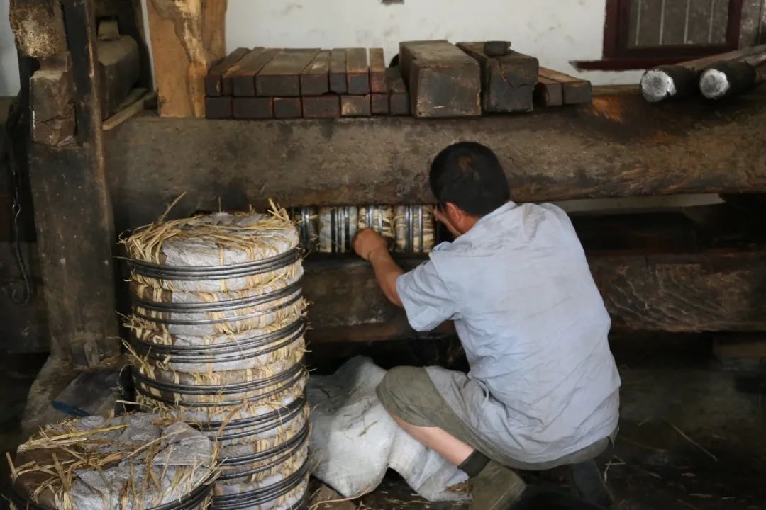稻草也是木榨油的必備工具,它和鐵圈相互配合,將蒸好的細(xì)粉包裹起來,然后踩平,這樣粉餅就準(zhǔn)備好了。