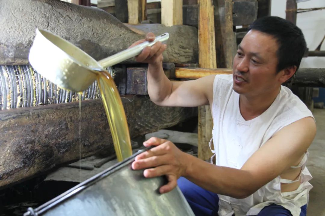 木榨油是純手工技藝,過程繁瑣。選籽、篩籽、炒籽、磨粉、蒸粉、結(jié)草、踩餅、上榨、插楔、撞榨、接油、沉淀、裝瓶,木榨油生產(chǎn)要經(jīng)歷十幾道工藝,一百多道流程。一名油匠學(xué)徒往往需要師傅口傳心授、學(xué)習(xí)四五年才能自己榨出一壺油。從一粒小小的芝麻到色澤金黃、淳香四溢的芝麻油,每一道工序都融入了榨油人的匠心。