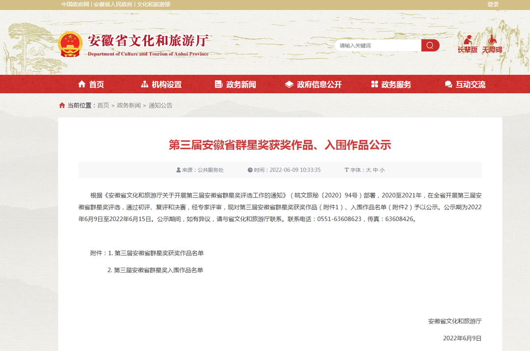 6月9日,安徽省文化和旅游廳發(fā)布第三屆安徽省群星獎(jiǎng)入圍及獲獎(jiǎng)作品通知,根據(jù)《安徽省文化和旅游廳關(guān)于開展第三屆安徽省群星獎(jiǎng)評選工作的通知》(皖文旅秘〔2020〕94號(hào))部署,2020至2021年,在全省開展第三屆安徽省群星獎(jiǎng)評選,通過初評、復(fù)評和決賽,經(jīng)專家評審,40件作品獲得安徽省群星獎(jiǎng),121件作品入圍。其中我市獲獎(jiǎng)作品有音樂門類3件,戲曲門類1件。