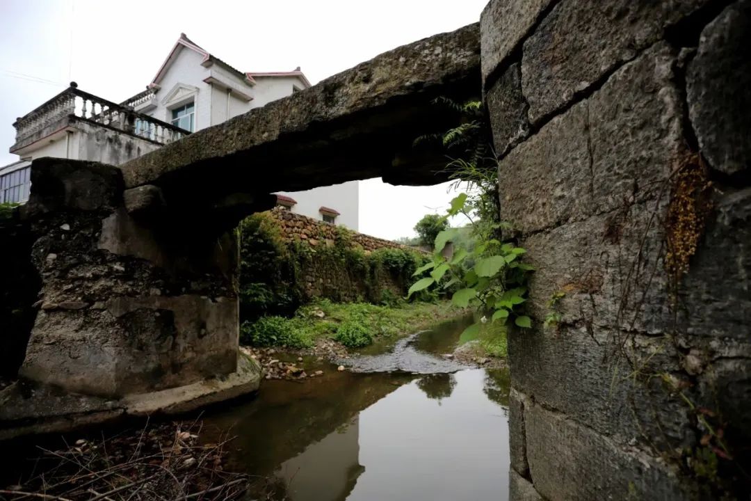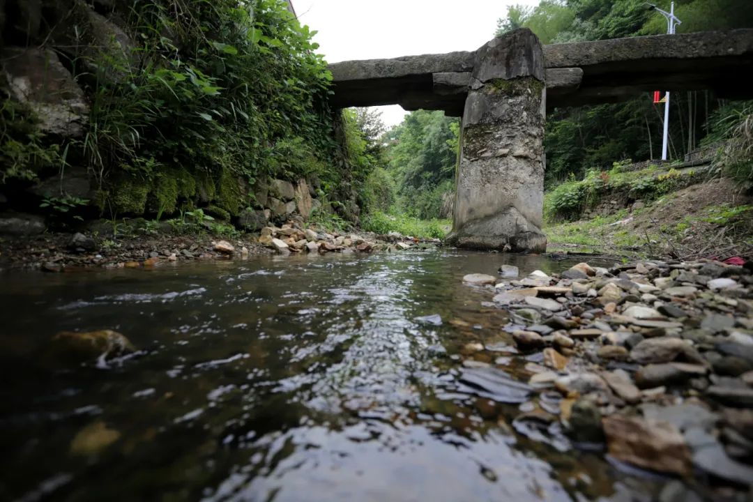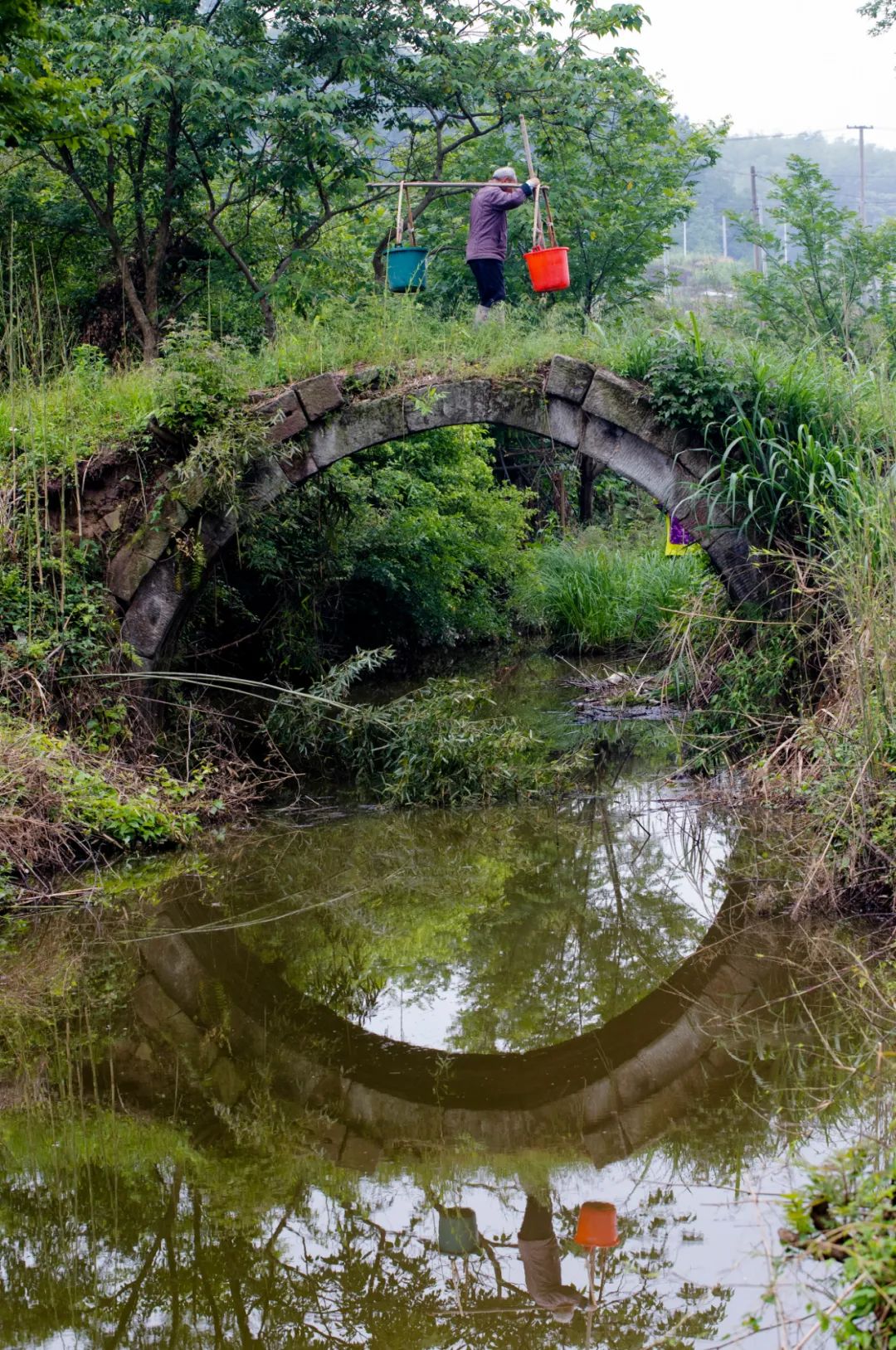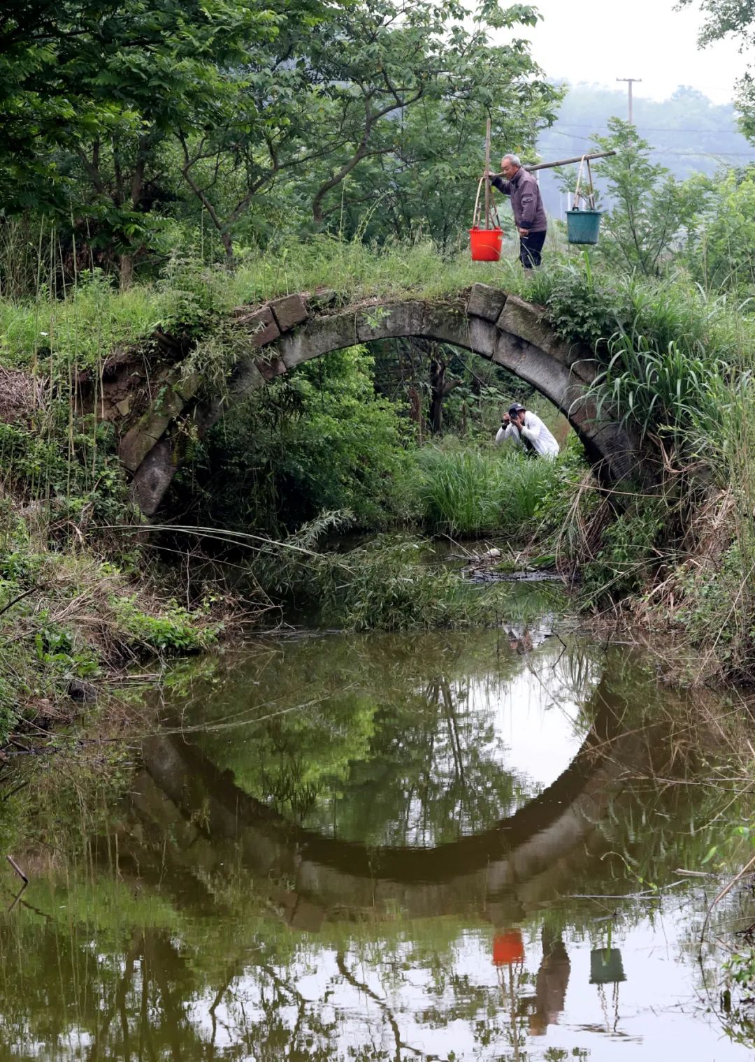 即便瘦成這樣的橋,依然很結(jié)實(shí),一塊塊石頭咬合著,巍然不動(dòng)。我們第三次去的時(shí)候,村里已經(jīng)安排人砍了雜草,整座橋的真面目才顯出來(lái),橋是半圓型,與水里的倒影合起來(lái),就是一個(gè)完整的圓。我們靜等著,等勞作的人從橋上經(jīng)過(guò),好拍一張照片。當(dāng)扛著鋤頭的婦人經(jīng)過(guò)時(shí),分明有江南的味道;當(dāng)挑擔(dān)子的老農(nóng)過(guò)來(lái)時(shí),溪水流淌著詩(shī)意。