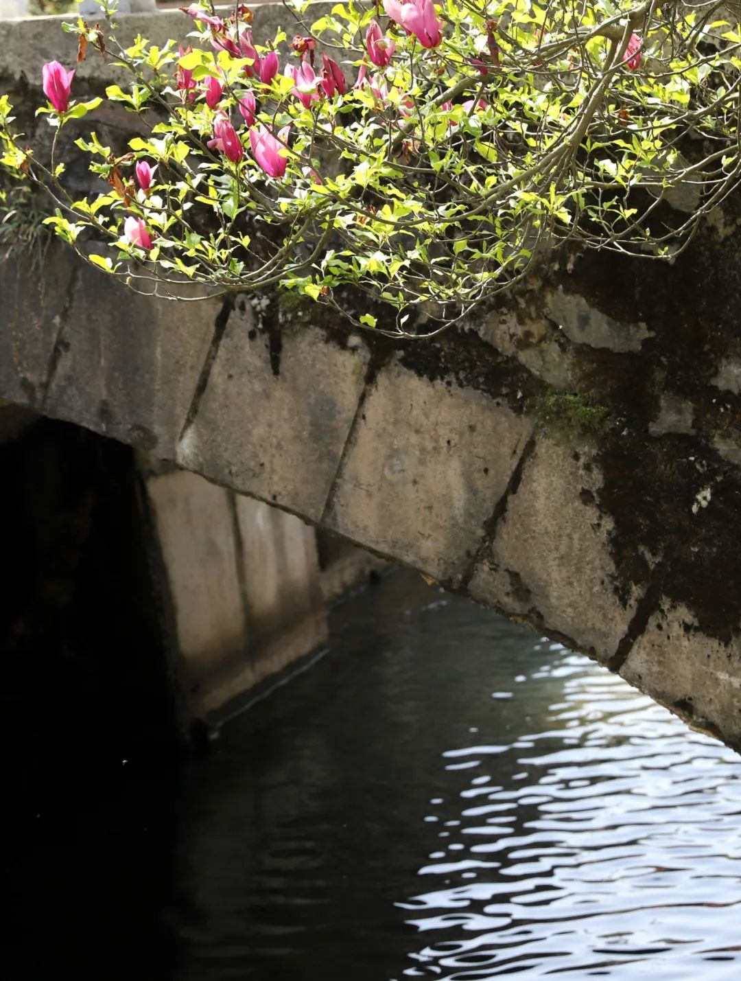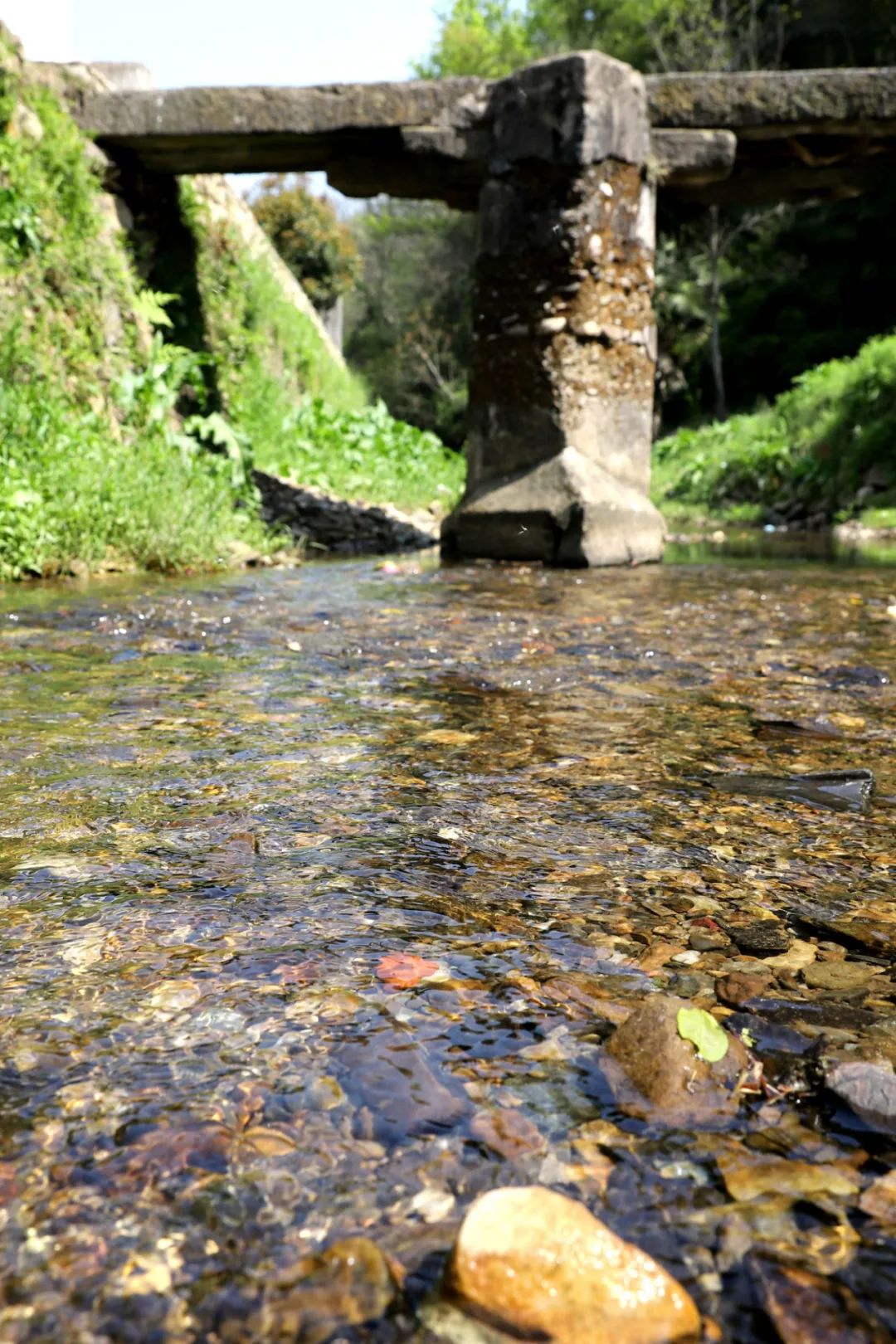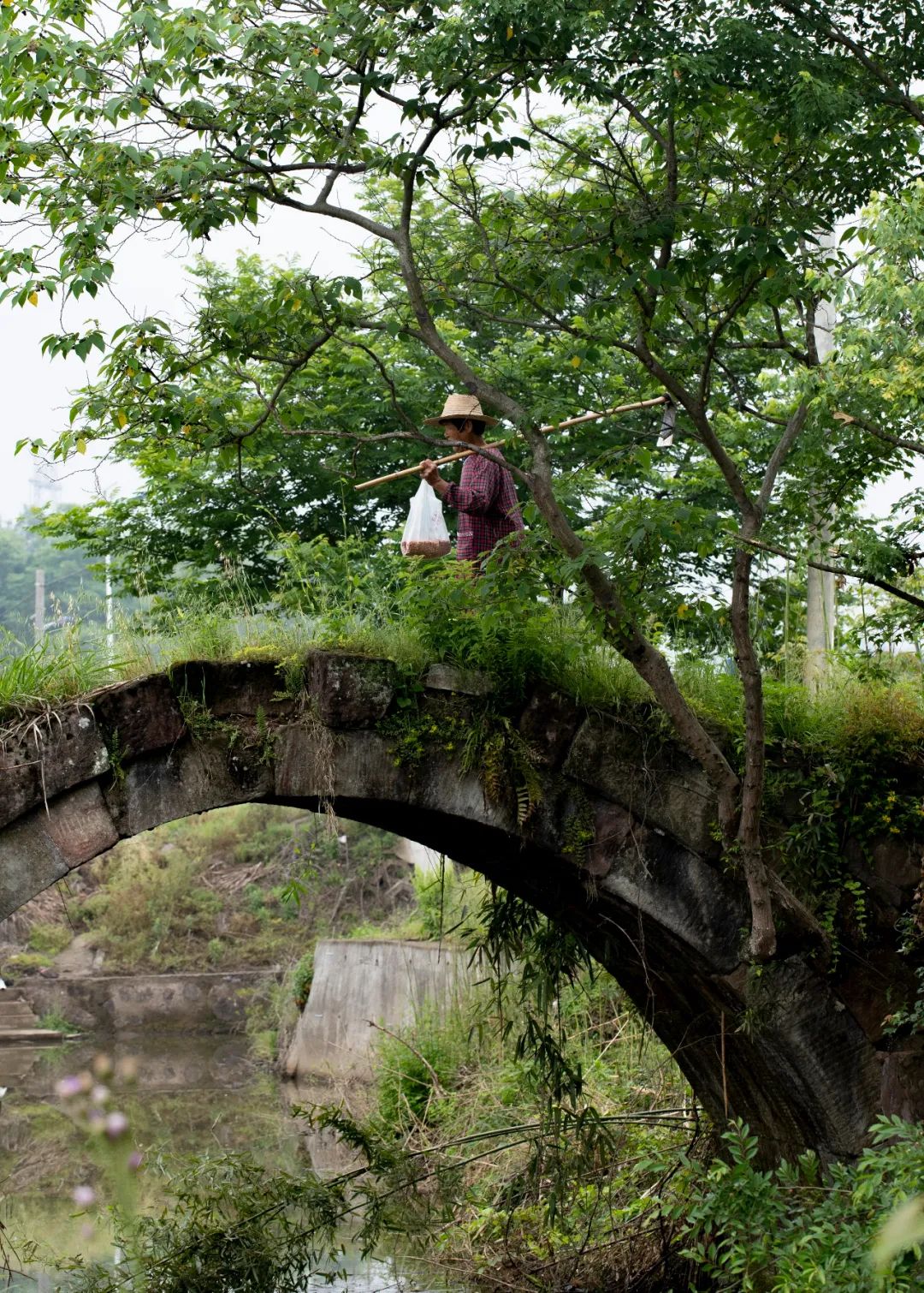 即便瘦成這樣的橋,依然很結(jié)實(shí),一塊塊石頭咬合著,巍然不動(dòng)。我們第三次去的時(shí)候,村里已經(jīng)安排人砍了雜草,整座橋的真面目才顯出來(lái),橋是半圓型,與水里的倒影合起來(lái),就是一個(gè)完整的圓。我們靜等著,等勞作的人從橋上經(jīng)過(guò),好拍一張照片。當(dāng)扛著鋤頭的婦人經(jīng)過(guò)時(shí),分明有江南的味道;當(dāng)挑擔(dān)子的老農(nóng)過(guò)來(lái)時(shí),溪水流淌著詩(shī)意。