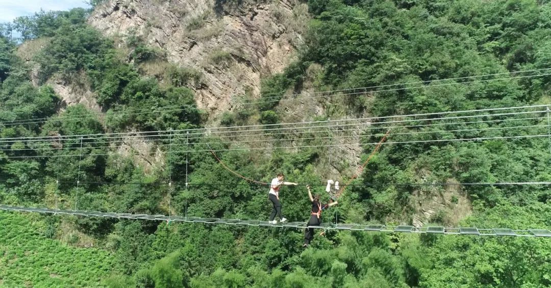 根據(jù)景區(qū)制定的現(xiàn)場處置方案,項目現(xiàn)場管理人員將現(xiàn)場發(fā)生的情況第一時間向景區(qū)應(yīng)急救援指揮部匯報,同時指派兩名現(xiàn)場工作人員穿戴好安全裝備,從吊橋處向被困游客進發(fā)。在抵達游客附近位置后,用景區(qū)定制的牽引繩將自行車捆綁好,兩名工作人員通力協(xié)作,一步步將自行車拉拽至項目終點。旁邊等候的醫(yī)療救護組第一時間詢問游客身體狀況,為游客遞上了防暑降溫的藥品和礦泉水,并安排游客在陰涼下休息。