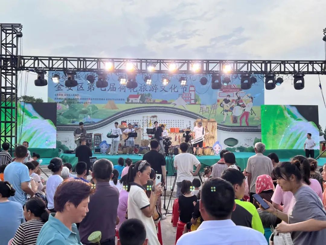 傍晚,一場(chǎng)荷塘音樂(lè)會(huì)準(zhǔn)時(shí)上演,民謠、搖滾樂(lè)隊(duì)用活力四射的live表演,開啟了荷花島“夜游”活動(dòng)的序幕,被彩燈點(diǎn)綴的露營(yíng)帳篷與廣袤鄉(xiāng)村的星空遙相呼應(yīng),“音樂(lè)+旅行”讓消夏活動(dòng)更有趣,為一場(chǎng)音樂(lè)會(huì)赴一座城,金安區(qū)木廠鎮(zhèn)找到了流量的密碼,荷花島煥發(fā)著生機(jī)和活力。