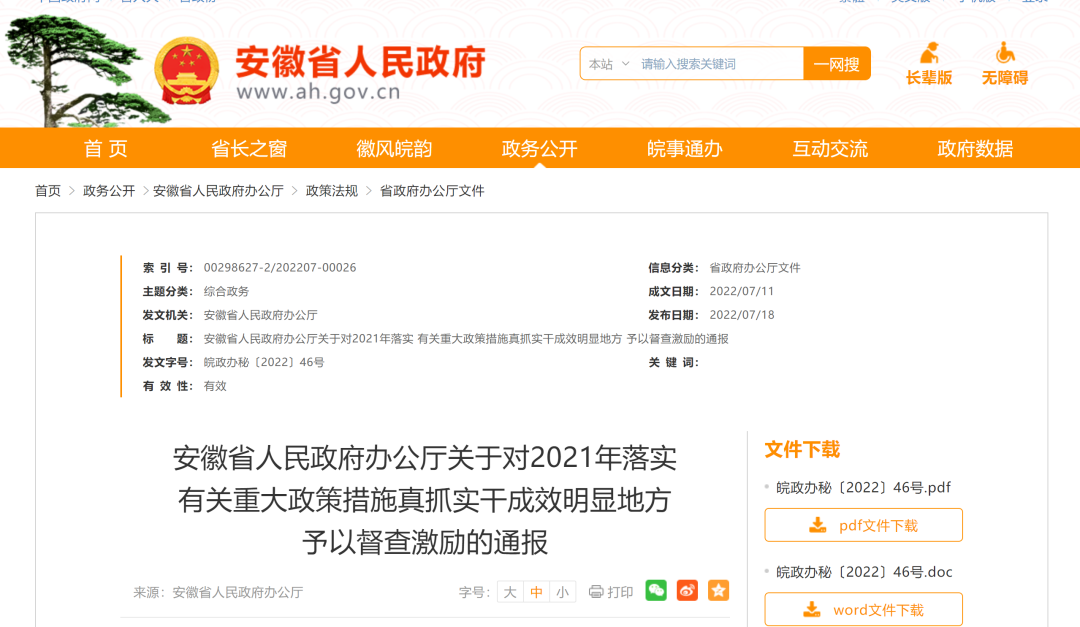7月18日,安徽省人民政府網(wǎng)發(fā)布《安徽省人民政府辦公廳關(guān)于對2021年落實有關(guān)重大政策措施真抓實干成效明顯地方予以督查激勵的通報》。