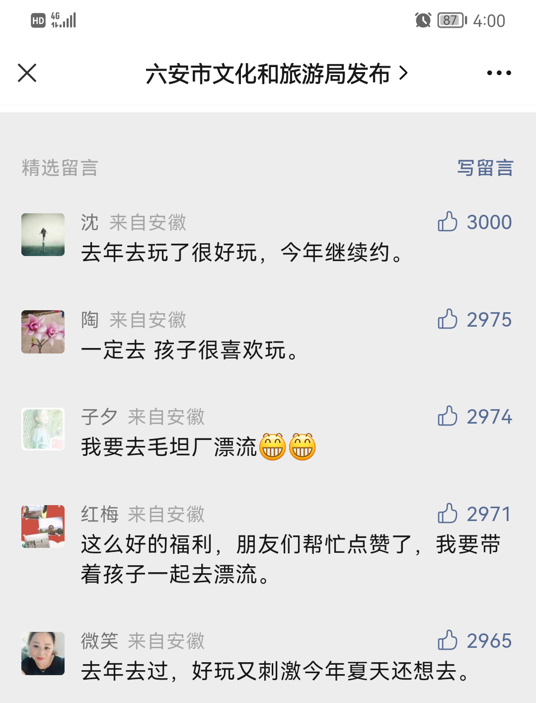 為回饋廣大網(wǎng)民朋友,六安市文旅局公眾號舉辦了“文末留言送毛坦廠翠谷漂流門票”活動。