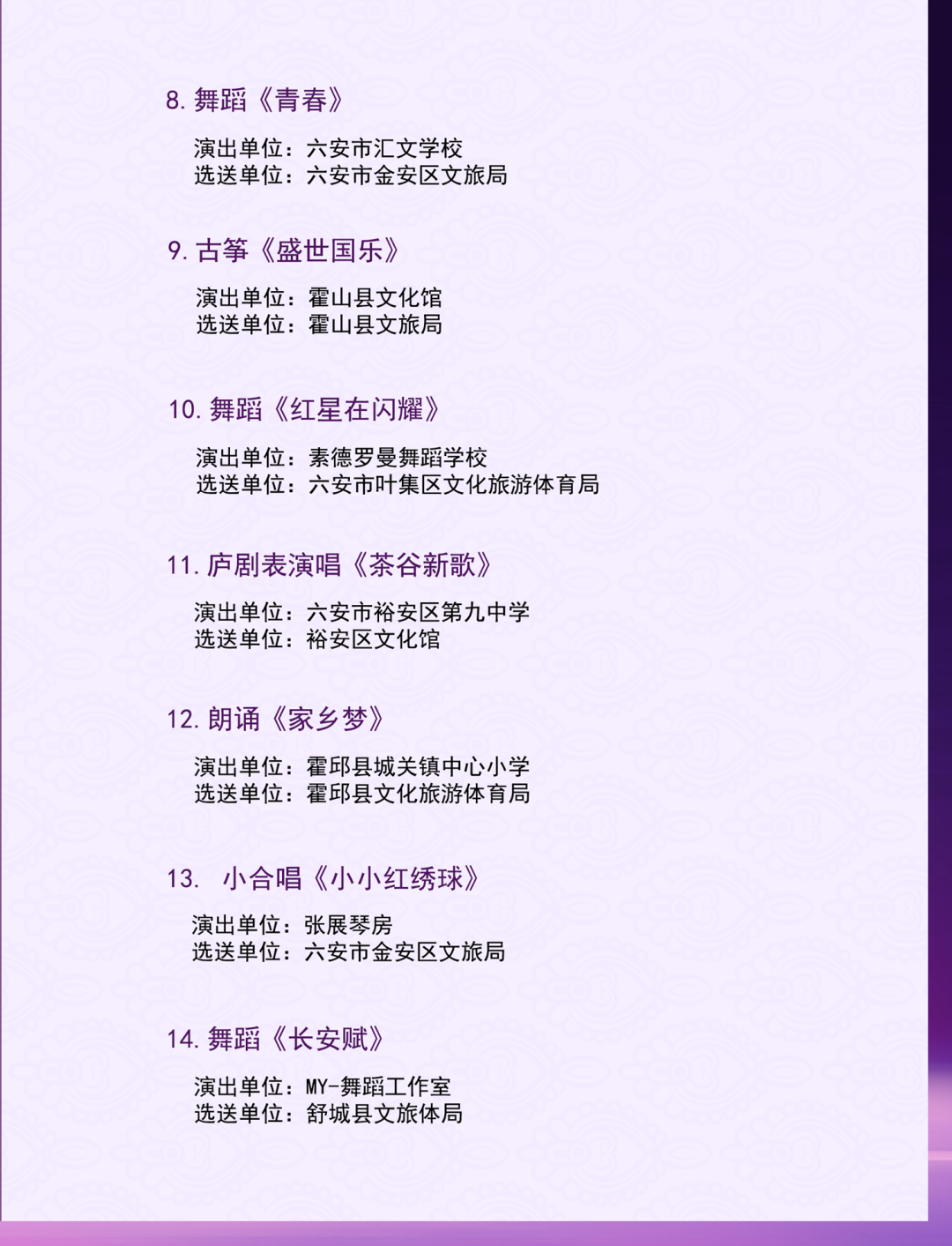 本次活動由中共六安市委宣傳部、六安市文化和旅游局、六安市婦女聯(lián)合會主辦,六安市文化館、六安市直關心下一代工作委員會承辦,各縣區(qū)文化和旅游局、六安市文化館聯(lián)盟協(xié)辦,活動遴選了14個“小小傳承人”文藝節(jié)目,節(jié)目類型涵蓋器樂、舞蹈、朗誦等多種形式。