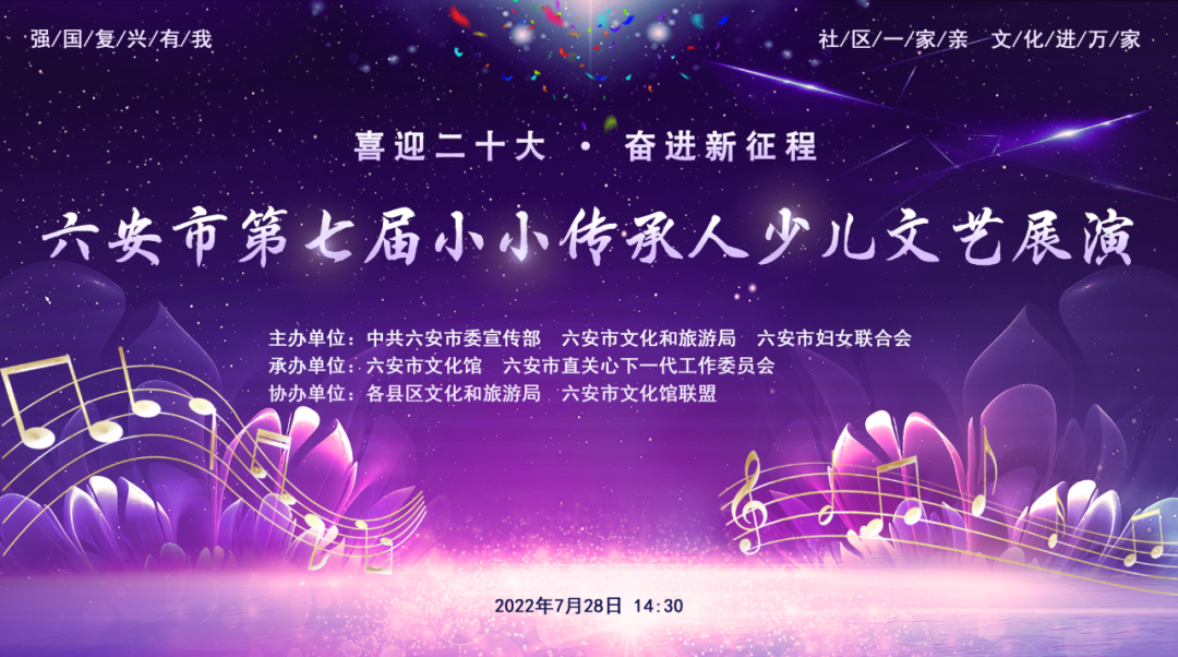 “喜迎二十大奮進新征程”六安市第七屆“小小傳承人”少兒文藝展演,7月28日在六安市文化館紅劇場正式開幕微信、抖音線上同步直播。
