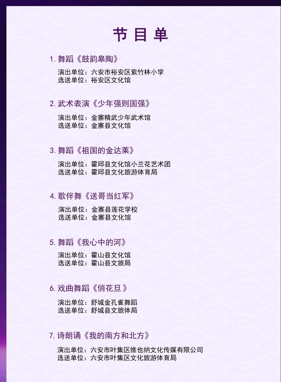 因疫情防控需要,本場展演不組織現(xiàn)場觀眾,全程為線上直播??赏ㄟ^微信公眾號“六安市文化和旅游局發(fā)布”“六安市文化館”“六安新聞網(wǎng)”或抖音搜索“六安文旅”“六安市文化館”觀看現(xiàn)場直播。(六安市文化和旅游局)
