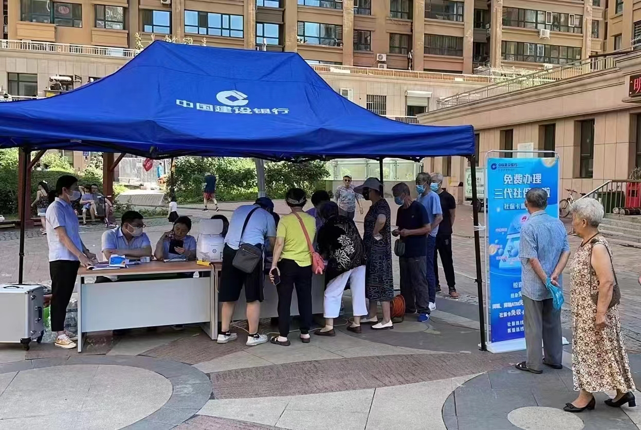 建設(shè)銀行哈爾濱香坊支行工作人員為社區(qū)居民辦理社???/p>