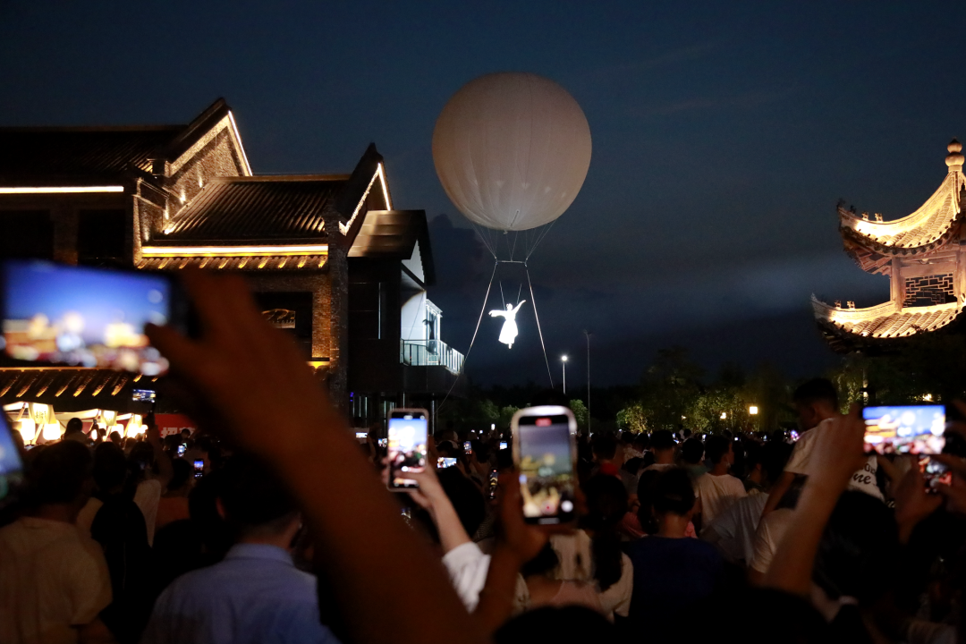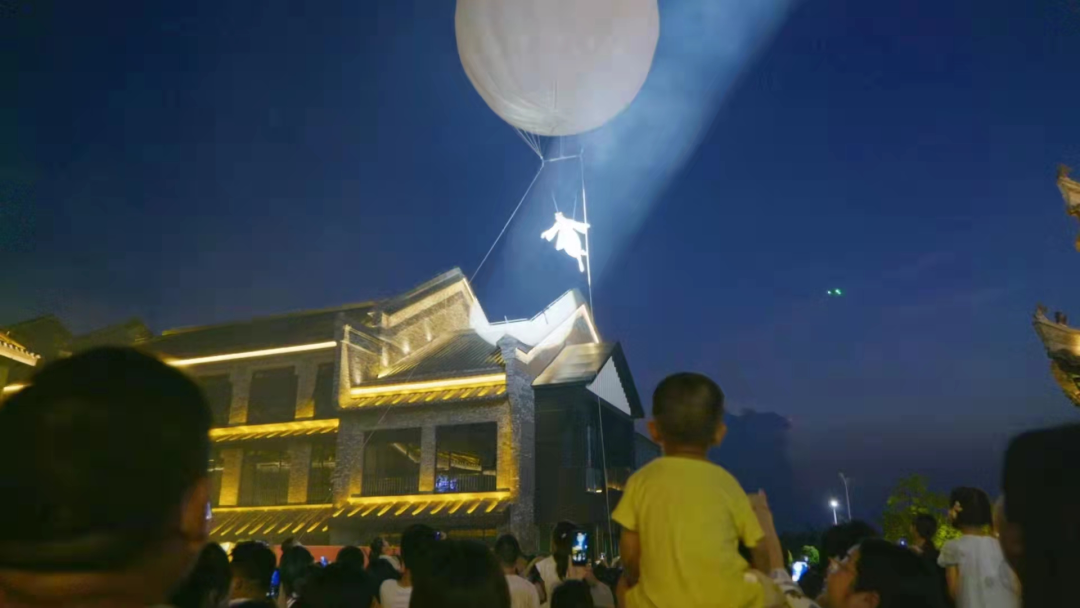 這邊上演光影交錯的視覺盛宴,那邊飄然而來天外飛仙。織女乘衣袂翩飛,牛郎踏星河騰躍,有情人凌空載舞,飛天相會。這個延續(xù)千年的癡情愛戀,將“皖美行動·七夕奇妙夜”活動推向高潮。