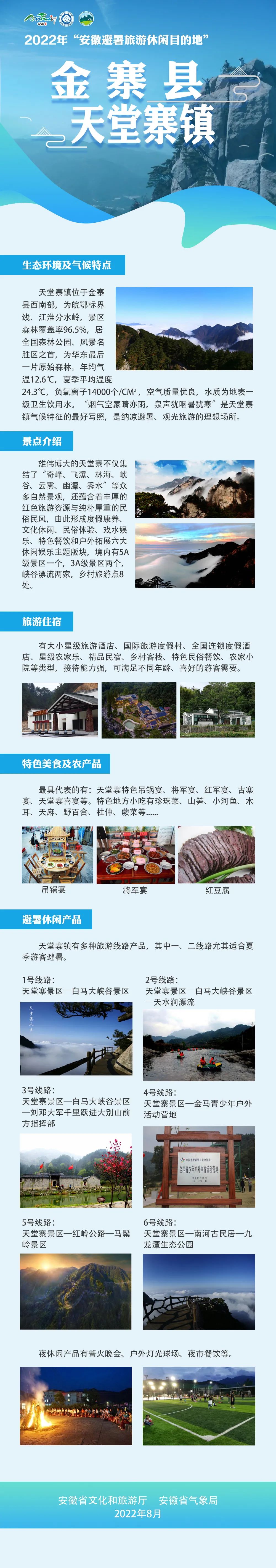 近日,安徽省文化和旅游廳與省氣象局聯(lián)合認定金寨縣天堂寨鎮(zhèn)等10家單位為第二批“安徽避暑旅游休閑目的地”。