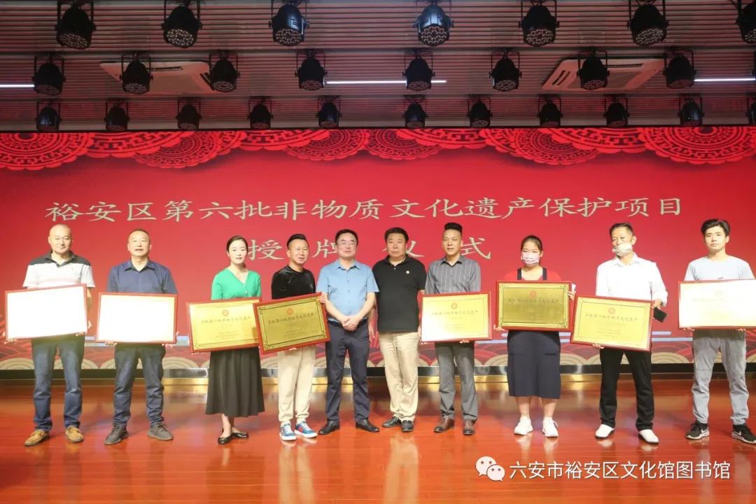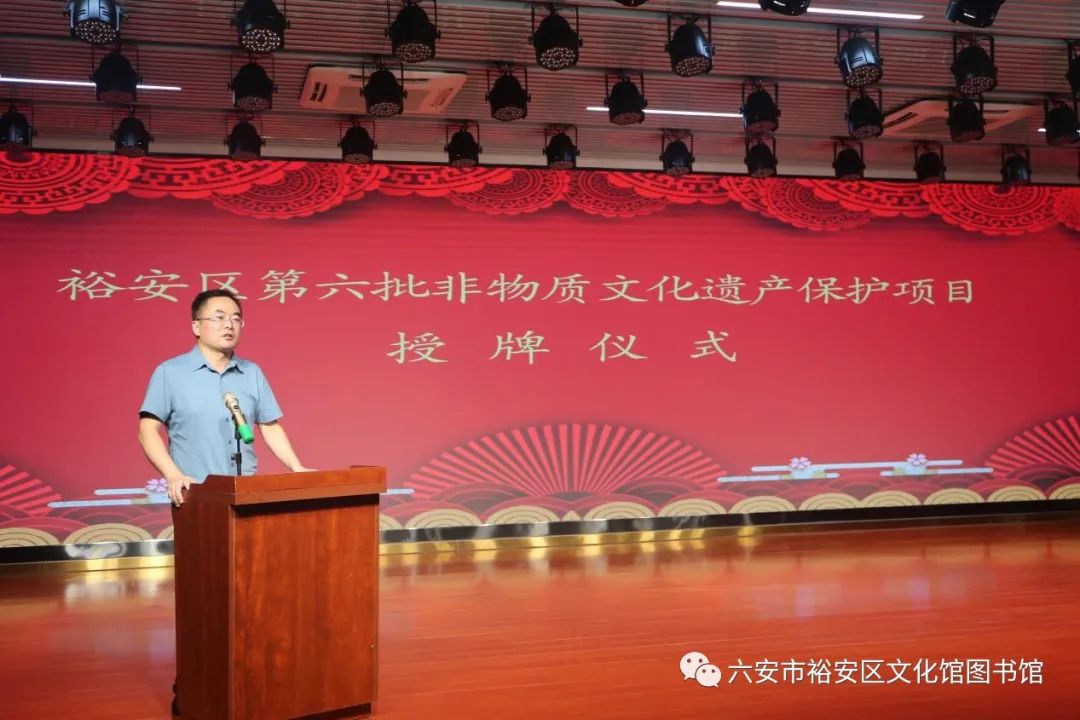 為進(jìn)一步提高人民群眾非物質(zhì)文化遺產(chǎn)保護(hù)意識(shí),營(yíng)造非物質(zhì)文化遺產(chǎn)保護(hù)的濃厚社會(huì)氛圍,9月1日,裕安區(qū)第六批非物質(zhì)文化遺產(chǎn)保護(hù)項(xiàng)目授牌儀式在區(qū)文化館裕星劇場(chǎng)順利舉行。裕安區(qū)文化館、圖書館館長(zhǎng)李從文,第六批非物質(zhì)文化遺產(chǎn)保護(hù)項(xiàng)目傳承人及負(fù)責(zé)人等20余人參加了授牌儀式。