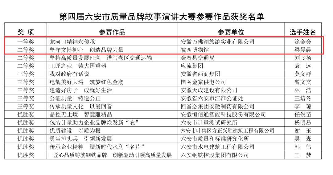 9月5日,2022年蘇浙皖贛滬四省一市質(zhì)量品牌故事演講大賽結(jié)果揭曉,并在全省“質(zhì)量月”啟動(dòng)儀式上進(jìn)行了宣布,安徽省共獲1個(gè)一等獎(jiǎng)、2個(gè)二等獎(jiǎng)、4個(gè)三等獎(jiǎng)、10個(gè)優(yōu)勝獎(jiǎng)。安徽省文化和旅游系統(tǒng)選送作品表現(xiàn)優(yōu)異,其中六安市選送的舒城萬佛湖旅游管理實(shí)業(yè)有限公司《龍河口精神永傳承》榮獲大賽一等獎(jiǎng)。