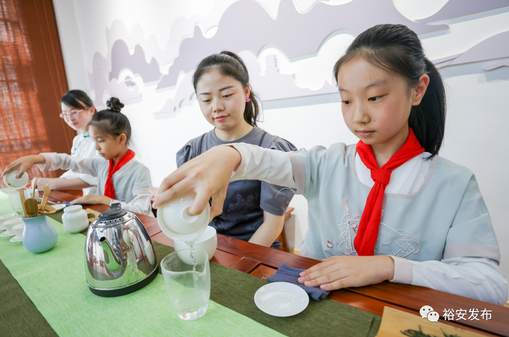在茶藝教室里,六安瓜片制作工藝傳承人顧修莉則帶著孩子們了解六安瓜片的歷史,學習沏茶的手法,伴著悠揚的古琴聲,孩子們認真地沏著一壺壺瓜片茶,獻給了在場的諸位老師?!拔移綍r也喜歡喝茶,我們六安有很悠久的茶文化歷史,我想更深入地去了解六安的茶文化。馬上要到教師節(jié)了,借著奉茶,我也想表達對老師們的感謝,祝老師們教師節(jié)快樂!”皮妙彤小朋友輕盈地邁著方步,將一杯杯瓜片端到了自己的授業(yè)恩師的面前。