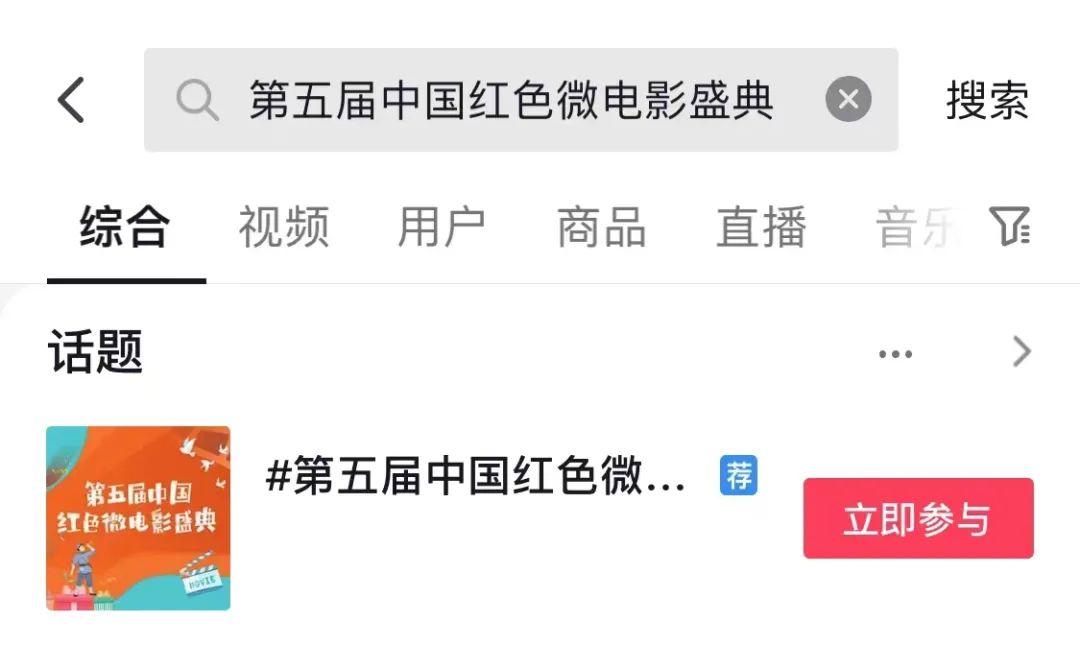 【方式一】:在抖音APP搜索“第五屆中國紅色微電影盛典”,點擊“立即參與”,拍攝并發(fā)布視頻,即完成參與。
