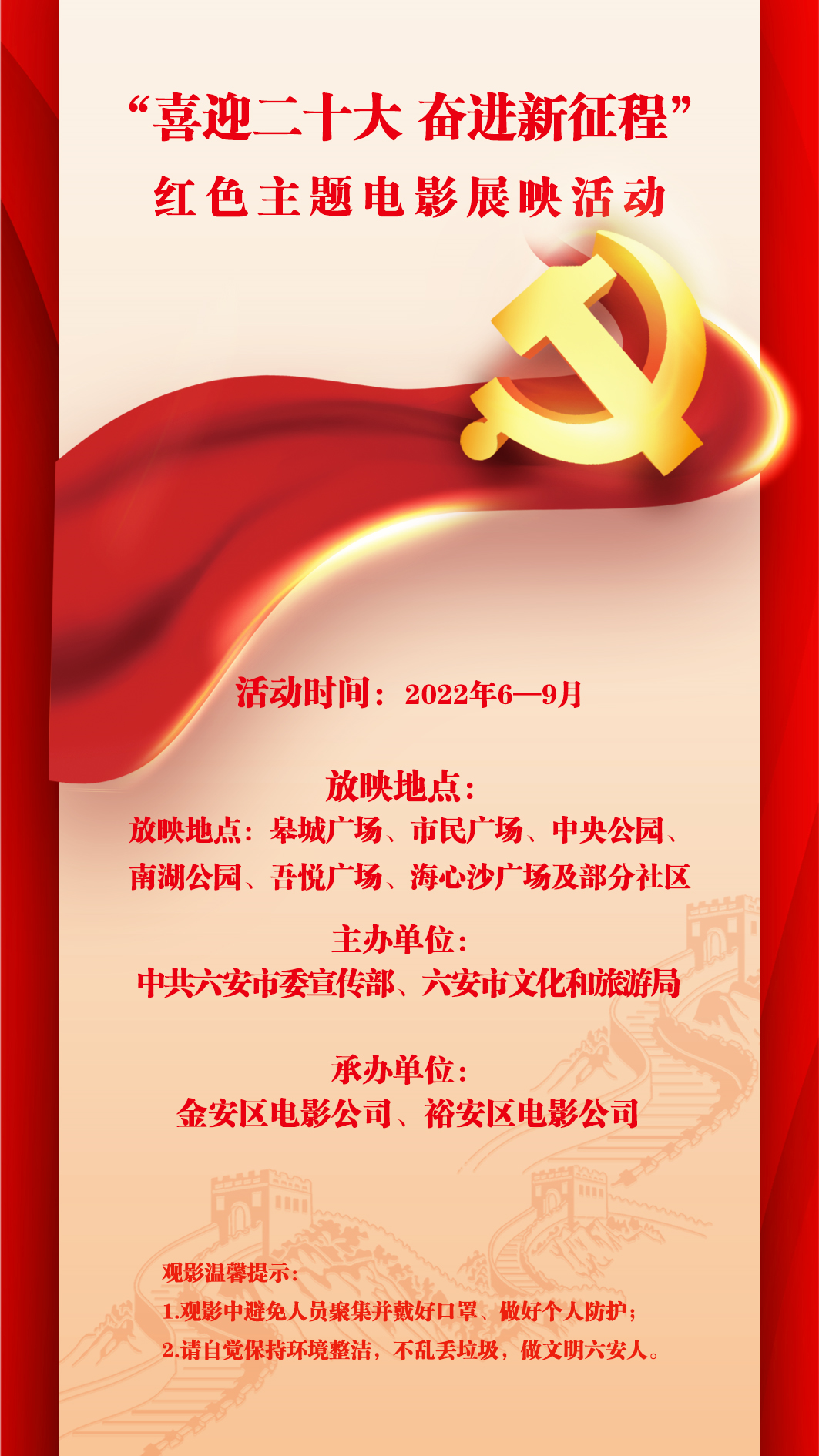 為豐富城區(qū)居民精神文化生活,打造我市文化精品活動,向黨的二十大獻禮,中共六安市委宣傳部、六安市文化和旅游局將于本周末啟動“喜迎二十大奮進新征程”紅色主題電影展映活動。通過系列紅色影片,用鏡頭帶大家走進那一段崢嶸歲月,教育引導大家感黨恩、聽黨話、跟黨走,激發(fā)廣大黨員群眾愛黨愛國情懷和干事創(chuàng)業(yè)熱情,為黨的二十大勝利召開營造良好氛圍,凝聚團結進取、奮發(fā)圖強的強大精神力量!
