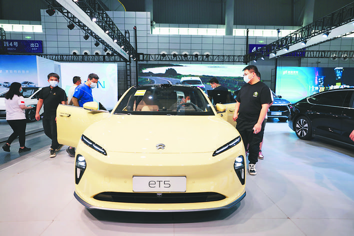 蔚來汽車展區(qū)的新車吸引不少市民前來體驗 記者宋炎駿 李予 攝