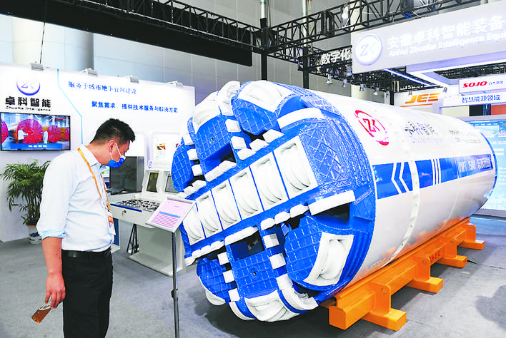 觀眾正在參觀由卓科智能生產(chǎn)的巖石破碎頂管機。記者 張大崗 攝