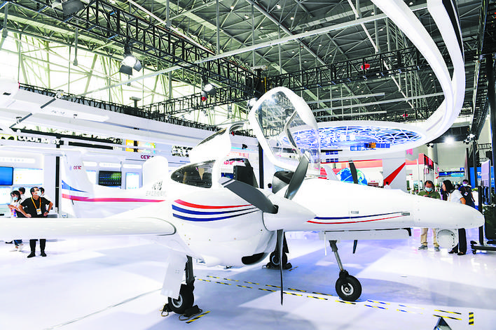 中國電科展館展出的“戰(zhàn)鴻”空中應(yīng)急指揮機。記者 張大崗 攝