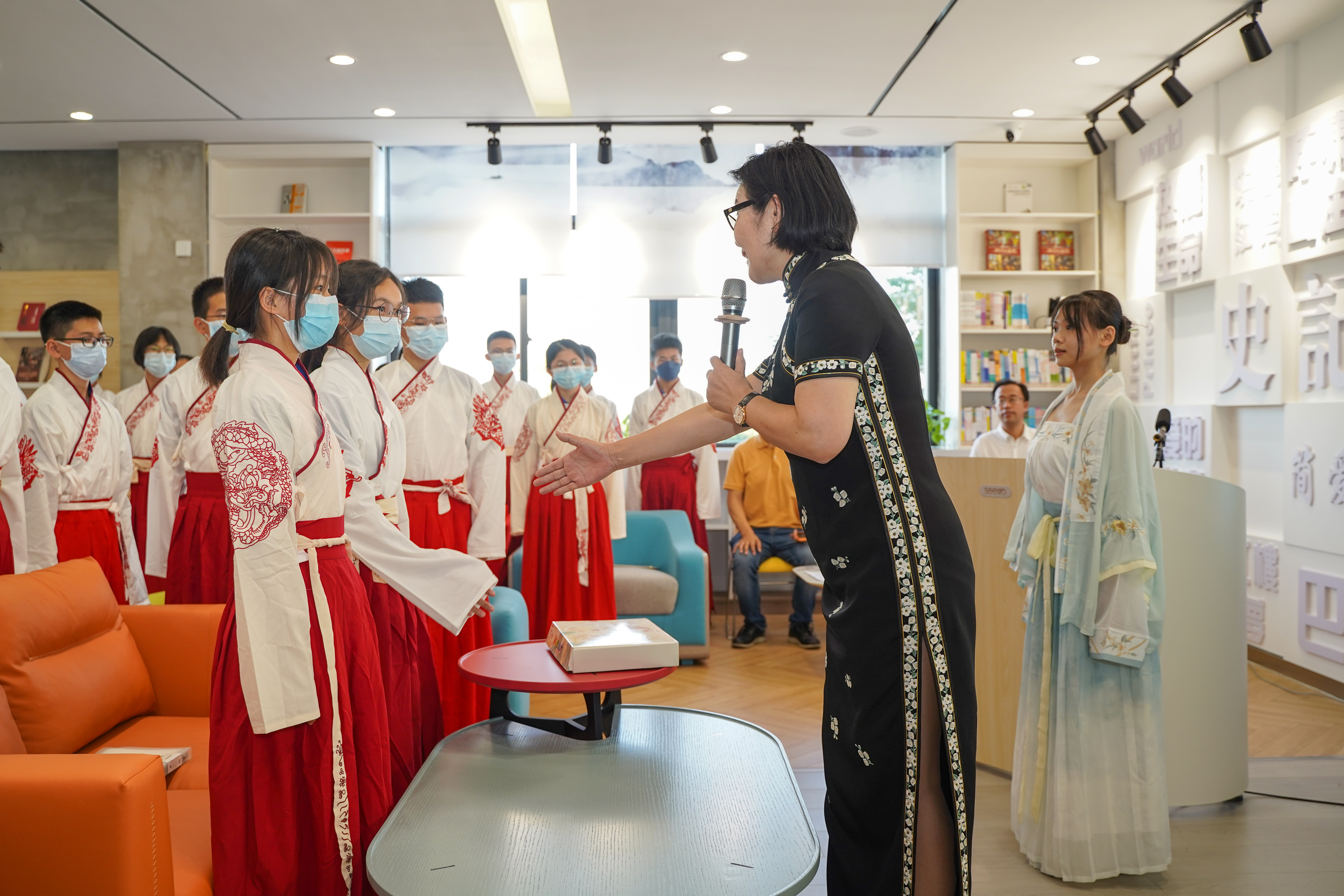 會場氣氛熱烈,周錦會長對回答問題優(yōu)秀的同學現(xiàn)場贈送華服,鼓勵同學們積極地成立“華服社團”,動手設計制作屬于自己的華服。