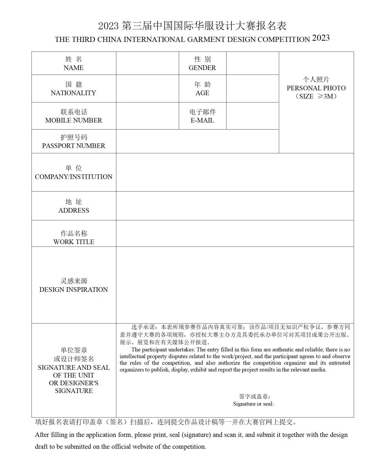 本人已詳細(xì)閱讀本次“第三屆中國(guó)國(guó)際華服設(shè)計(jì)大賽”評(píng)選辦法,愿意遵守相關(guān)規(guī)定,并作出承諾如下: