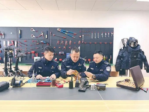 (賀麗遠(yuǎn)(中)帶領(lǐng)大隊(duì)民警研究爆炸裝置拆除技術(shù) 蔣迪亞攝)