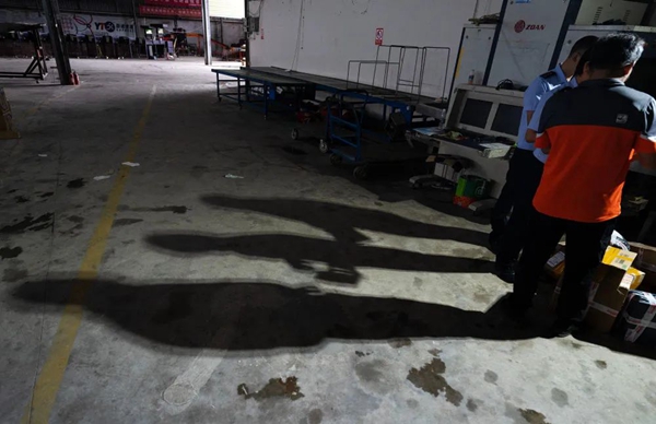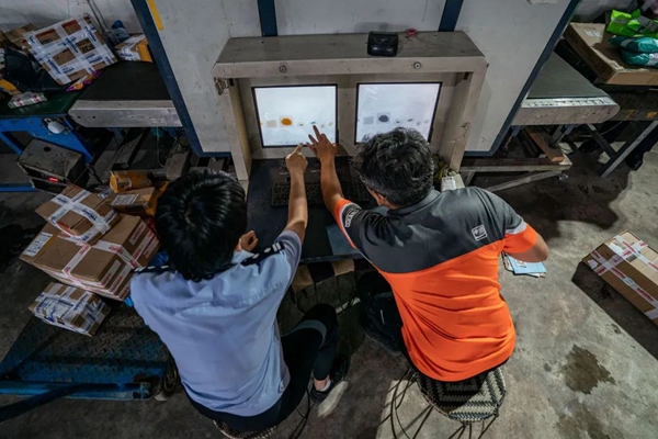 (7月12日,尹銘燕(左)在芒市一處物流點(diǎn)對快遞包裹進(jìn)行查緝。新華社記者胡超/攝)