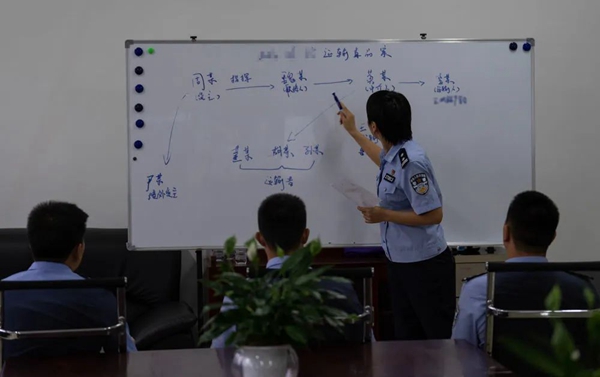 (7月13日,尹銘燕(右二)和同事在模擬進(jìn)行案情分析和推演。新華社記者費(fèi)茂華/攝)