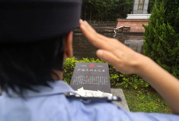 (7月12日,尹銘燕在隴川縣烈士陵園尹銘志的墓碑前敬禮。新華社記者費(fèi)茂華/攝)