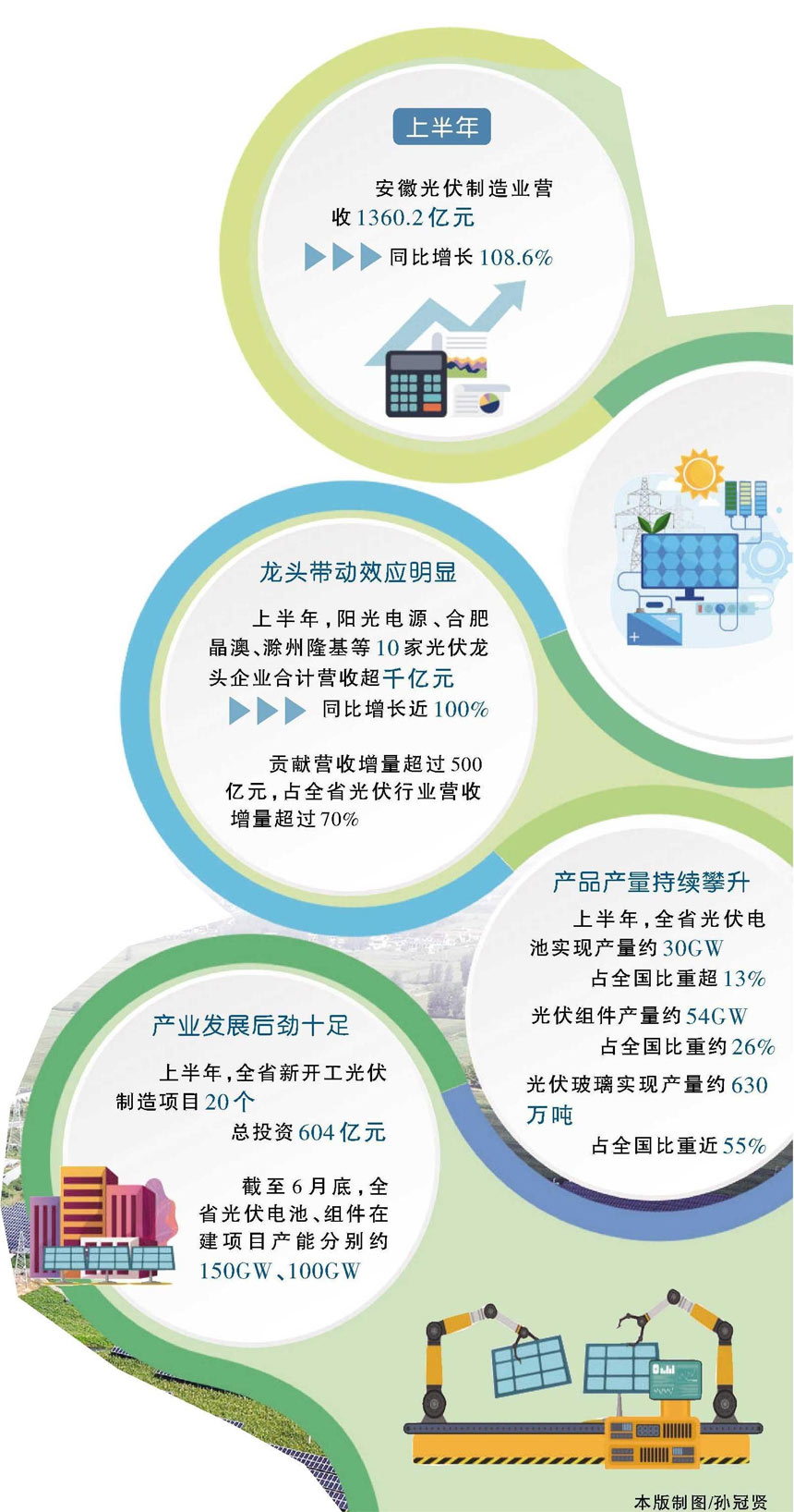 今年上半年,陽(yáng)光電源、合肥晶澳、滁州隆基等10家光伏龍頭企業(yè)合計(jì)營(yíng)收超千億元,同比增長(zhǎng)近100%;貢獻(xiàn)營(yíng)收增量超過(guò)500億元,占全省光伏行業(yè)營(yíng)收增量超過(guò)70%。